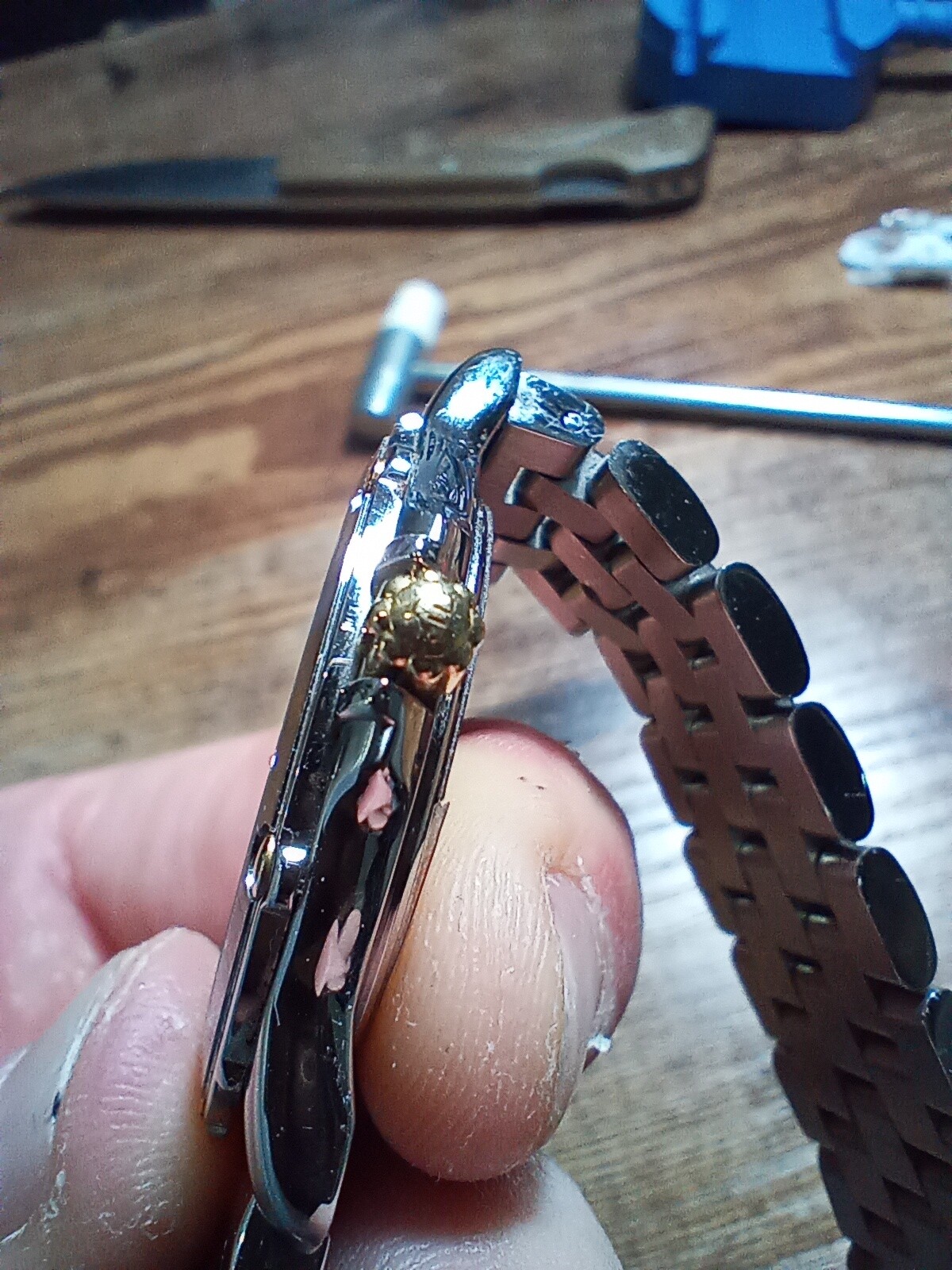 6 tornillos de oro 18k en el bisel. Corona de oro 18k. Índices de oro, y logo de oro en el dial.