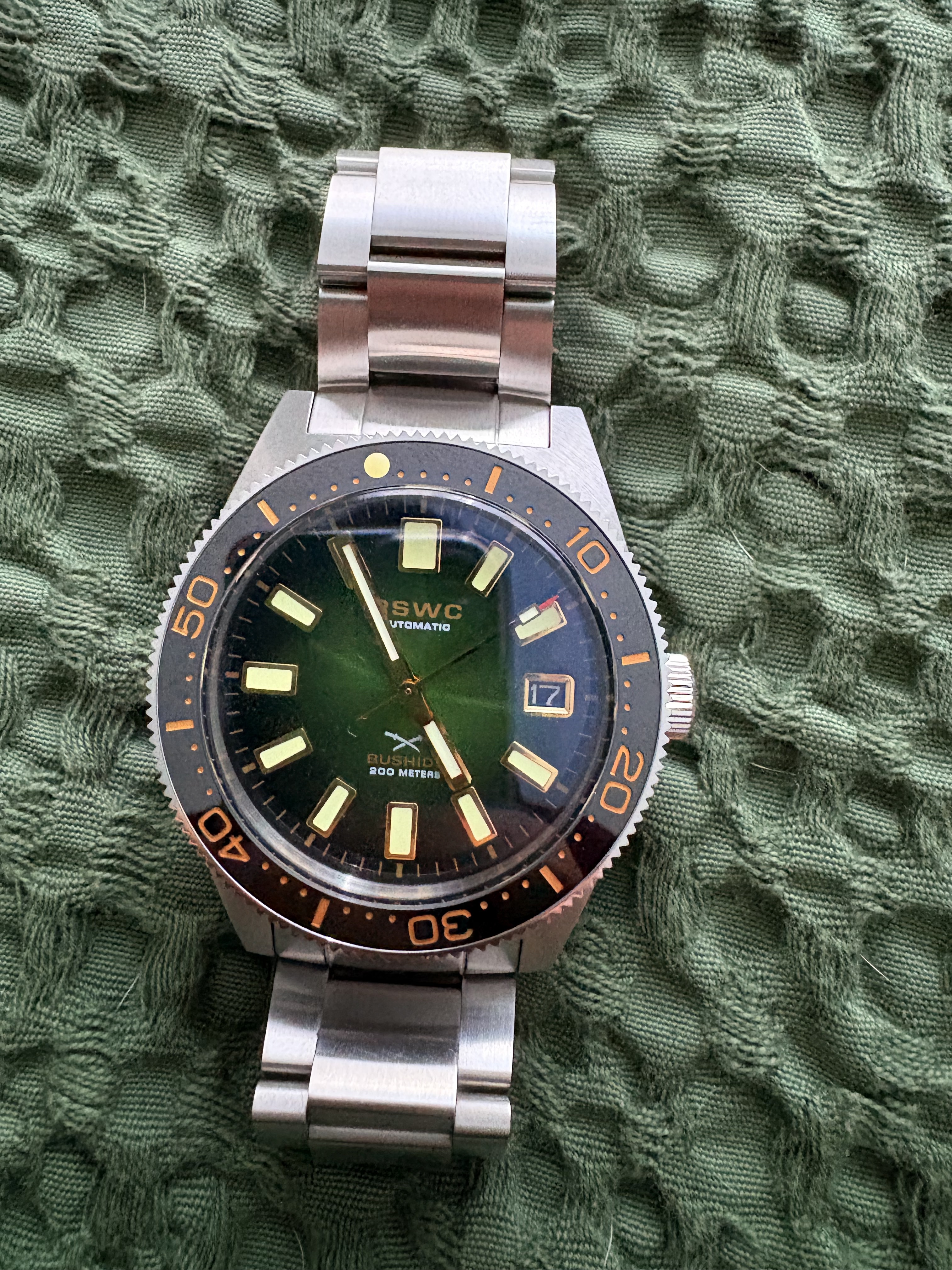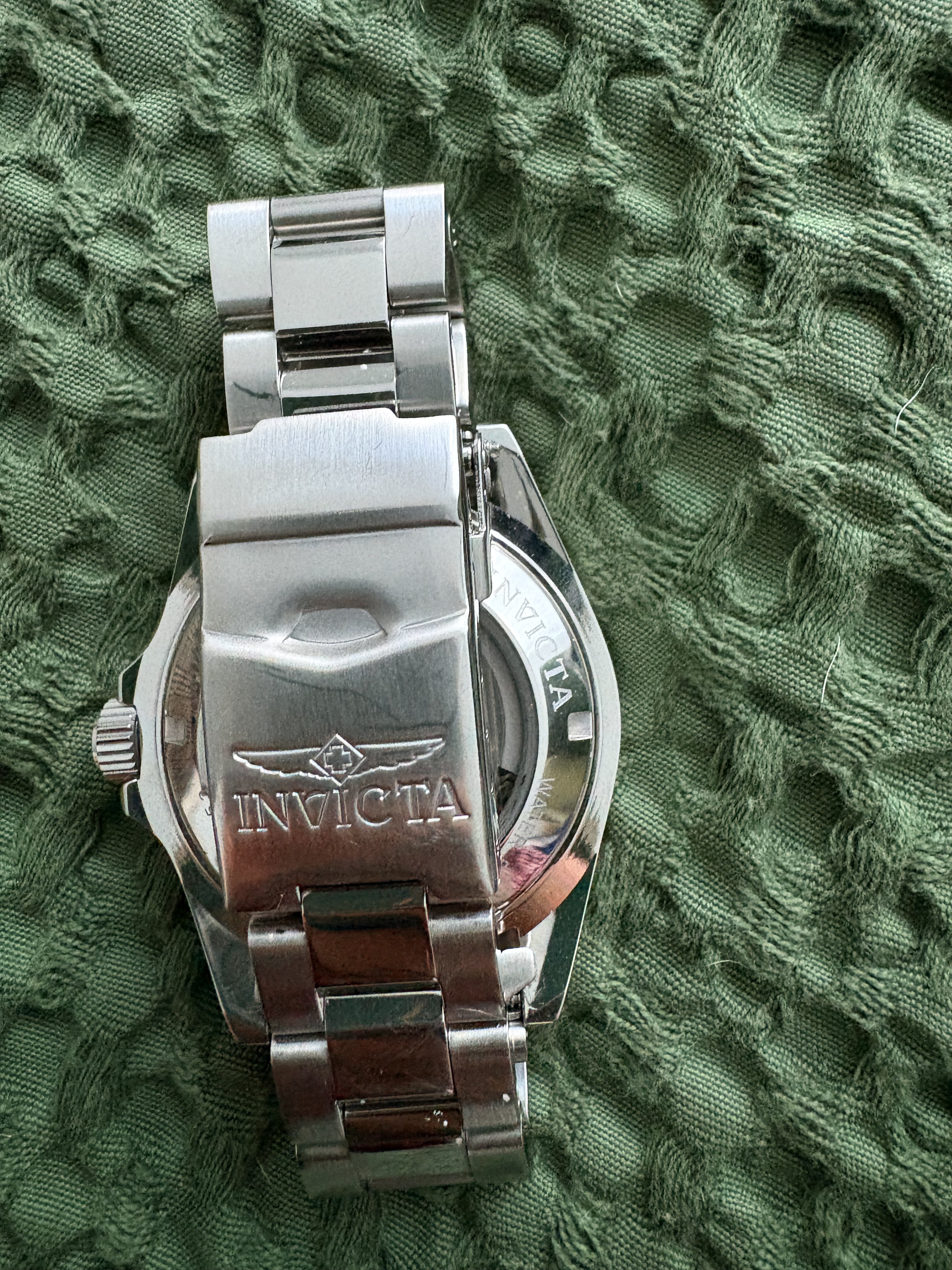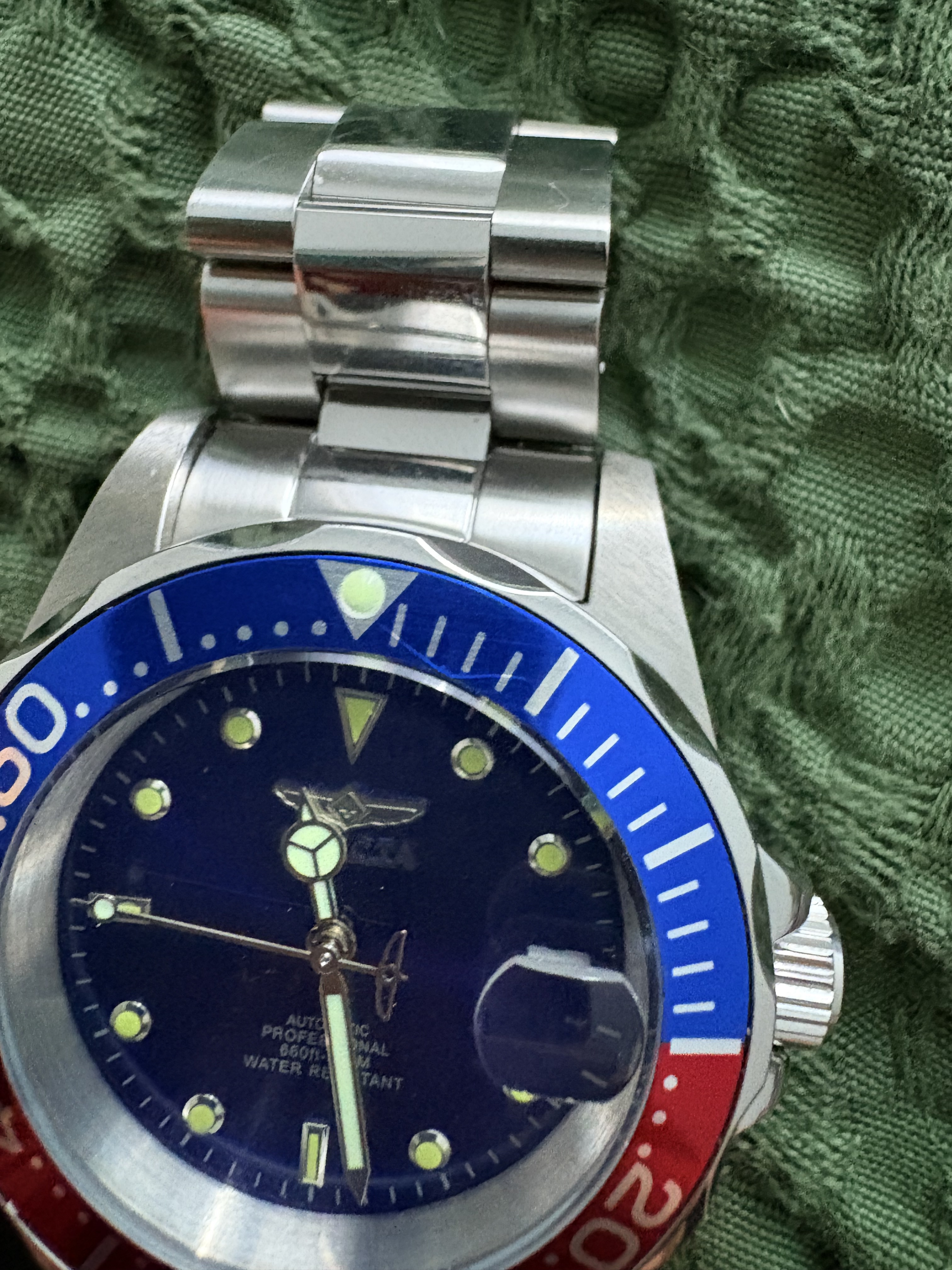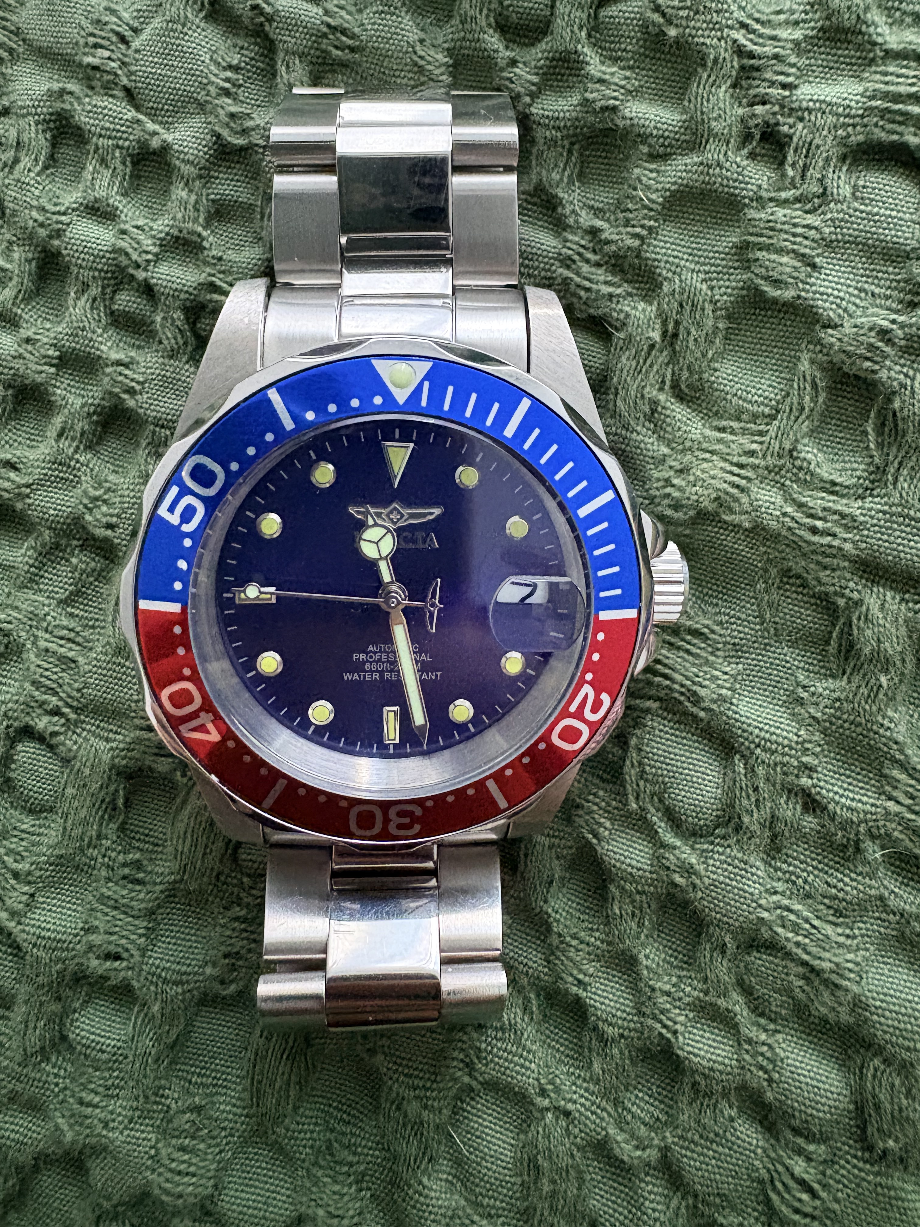 Diver basico, invicta pro diver “pepsi”. Mas usado pero muy cuidado. Tiene un pelo en el bisel de acero (ver foto) y un par muy suaves en cierre (ver foto). Recuerdo sus 40mm caja, movimiento nh35A, corona roscada con 200m WR. Sin caja original pero tarjeta de garantía (abril 2024).