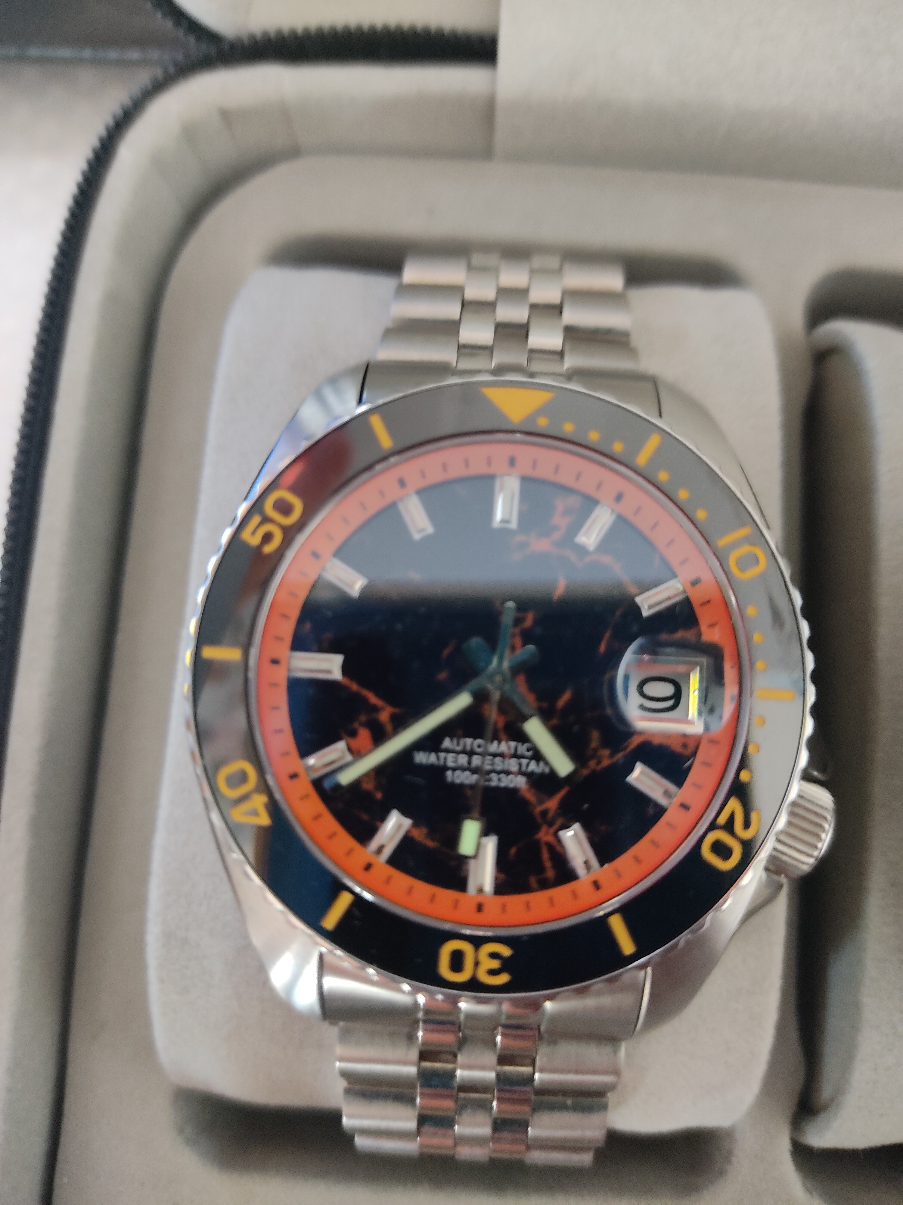 reloj Cadisen caja 40mm tipo skx calibre nh35 que se le ha cambiado agujas dial tipo marmol y brazalete mucho mejor que el que traia.Precio 100€ envio incluido correos certificado.