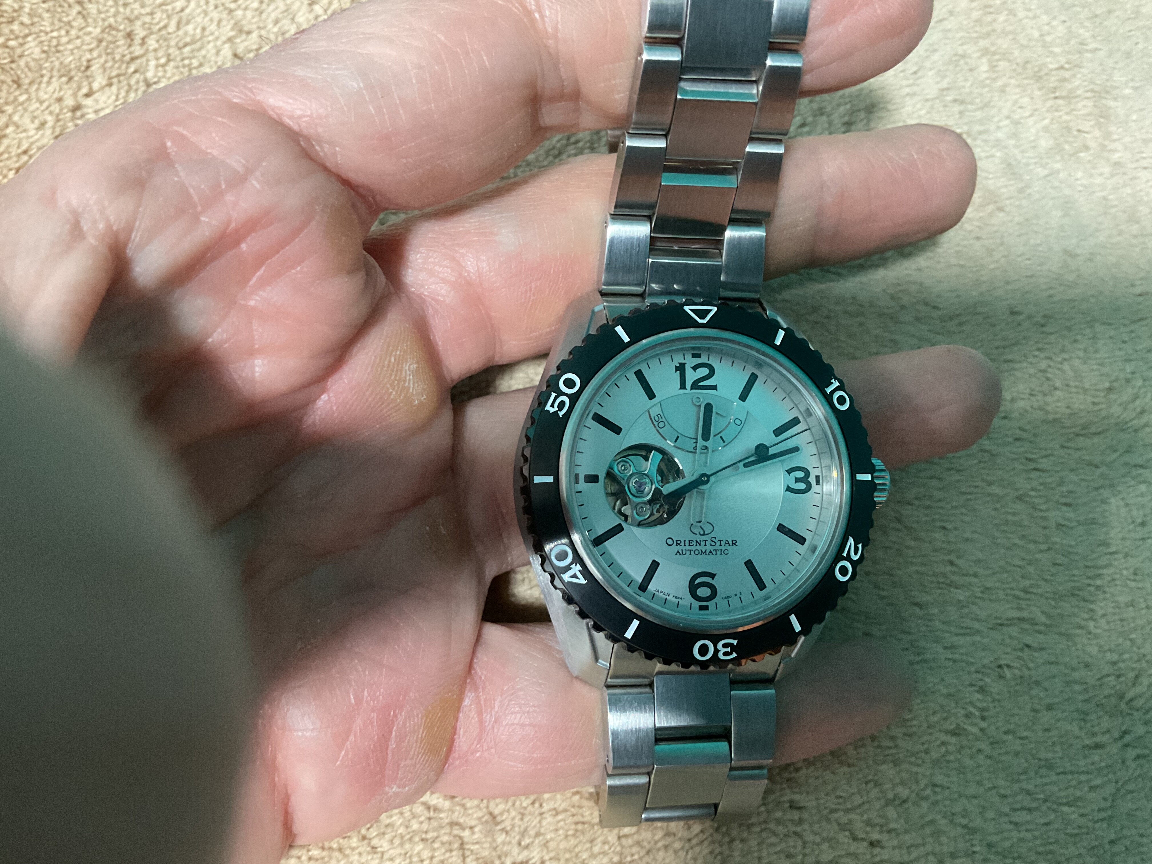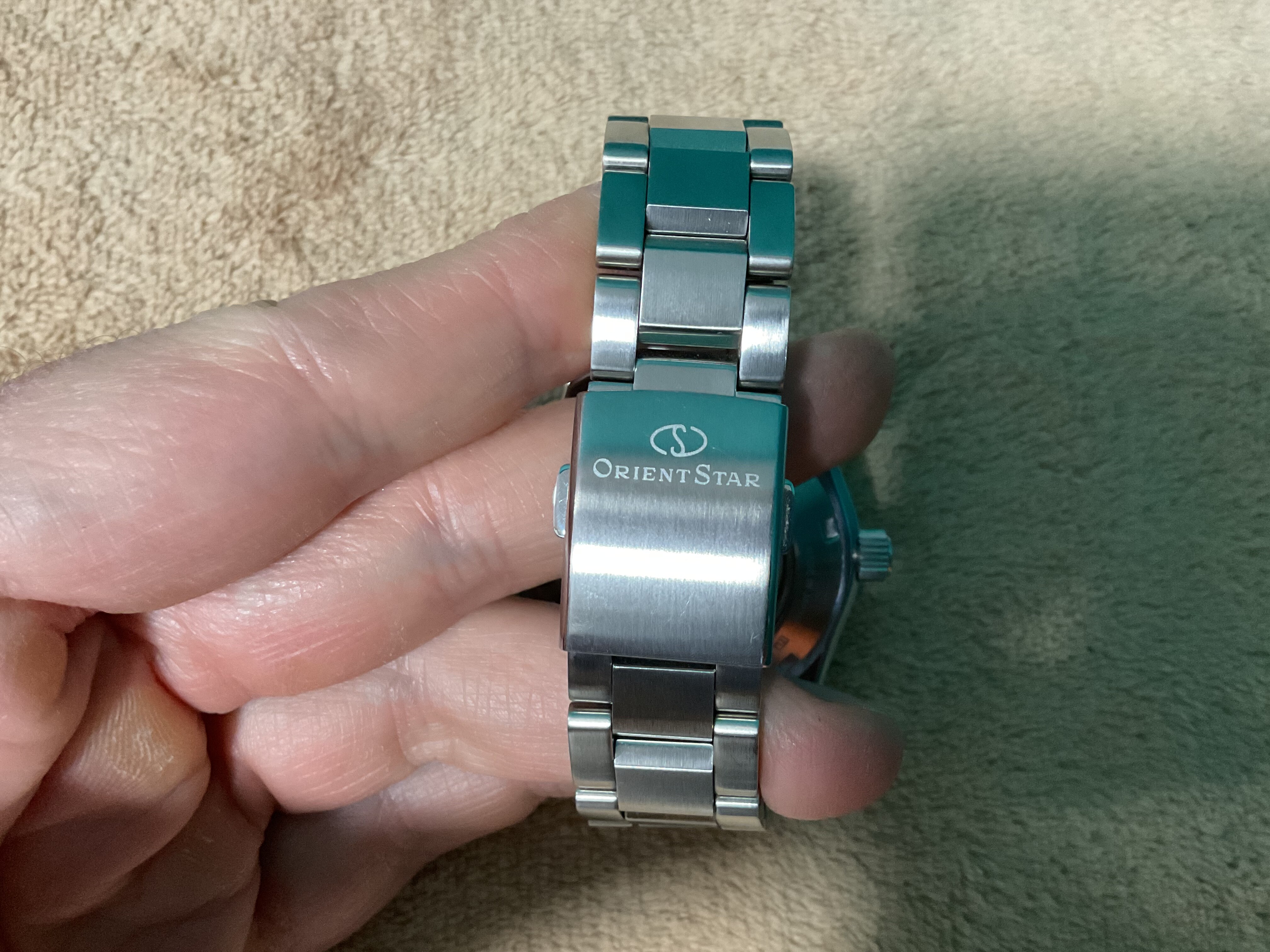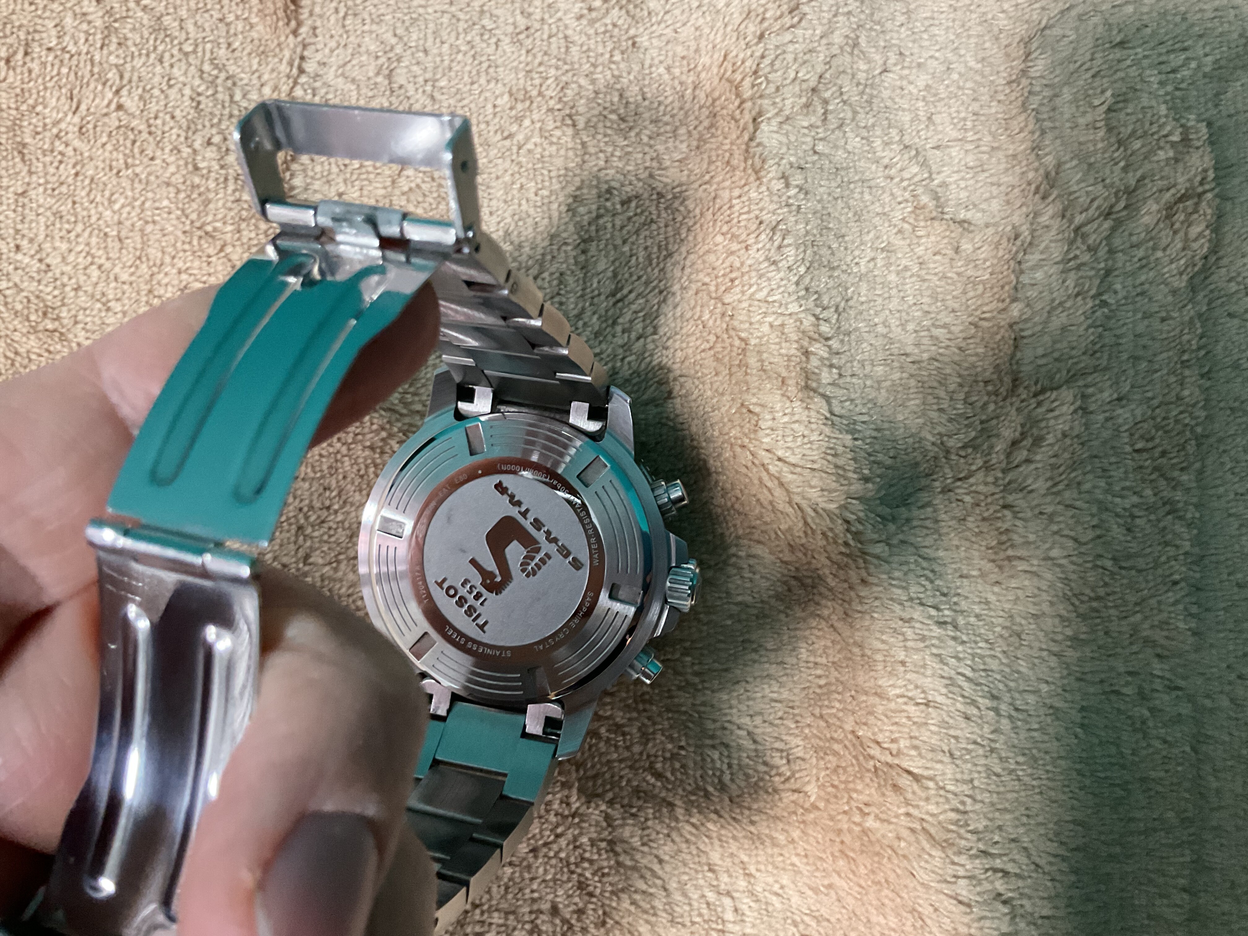 Pieza en muy buen estado, de sobra conocida. Resistencia de 300 metros, movimiento de cuarzo ETA, corona y pulsadores roscados, cristal de zafiro. Pila cambiada hace unos pocos meses. Aunque sus 45 milímetros parezcan abusivos, añado una foto en mi muñeca de 17.5 cm para que veáis cómo queda.