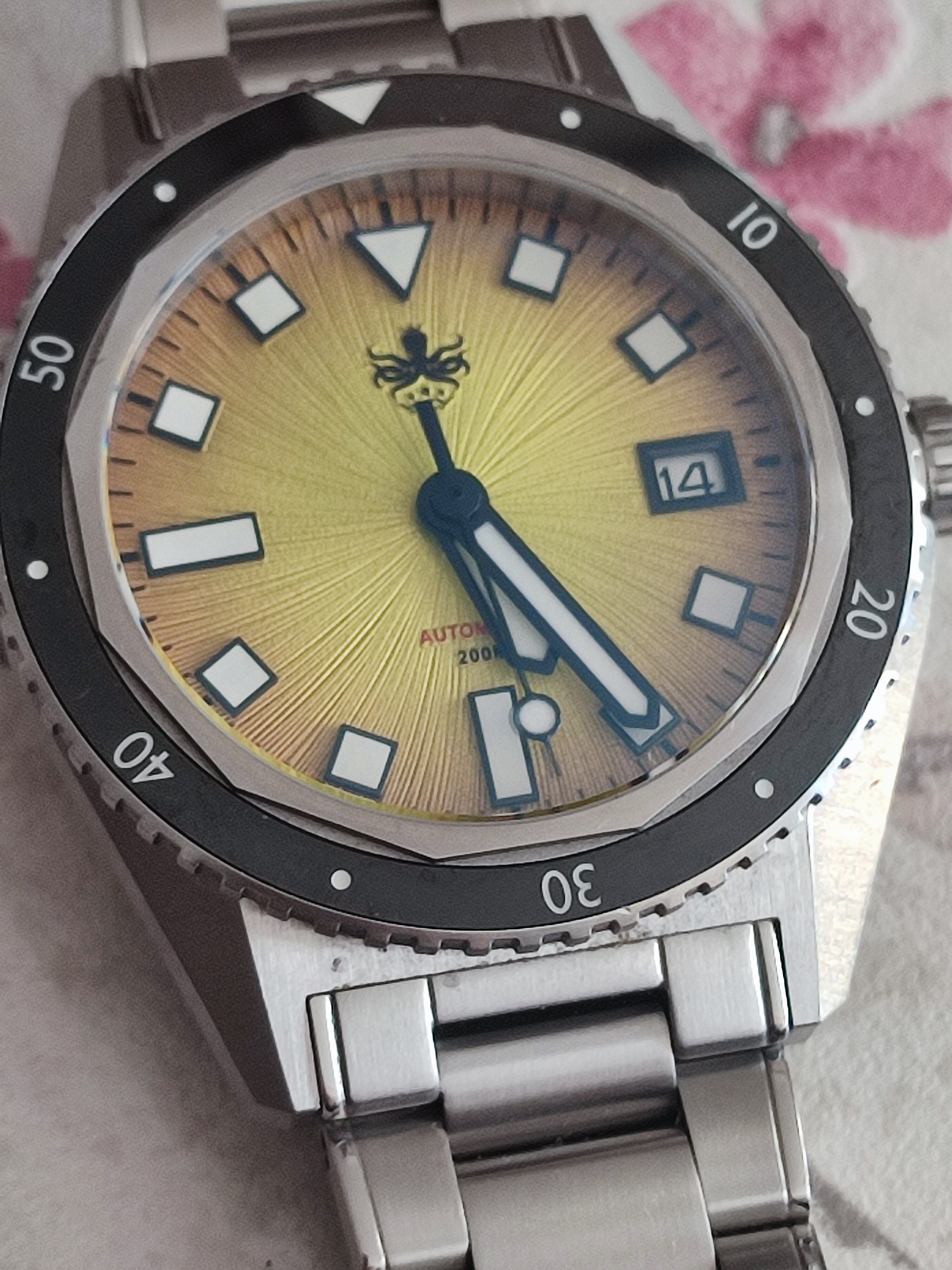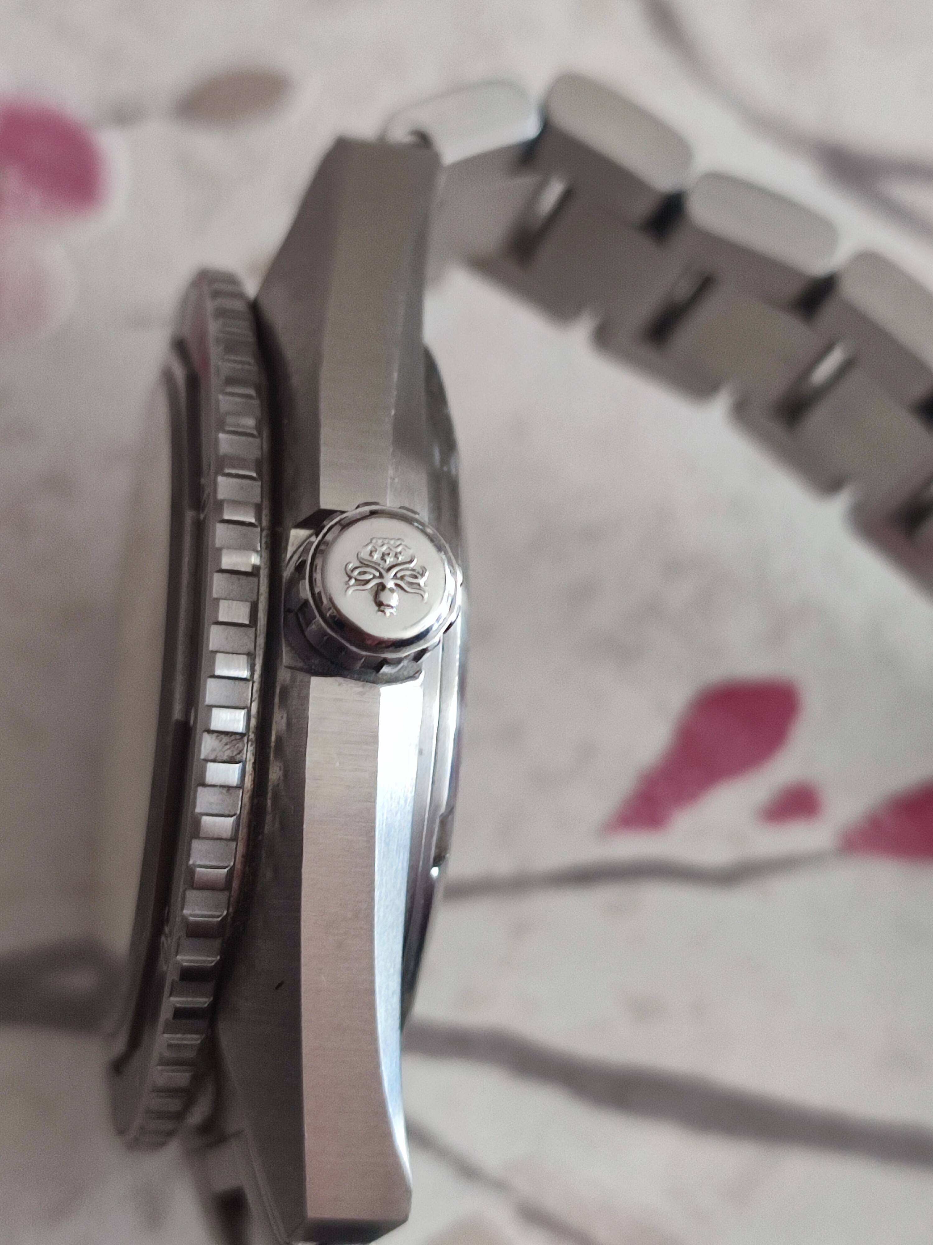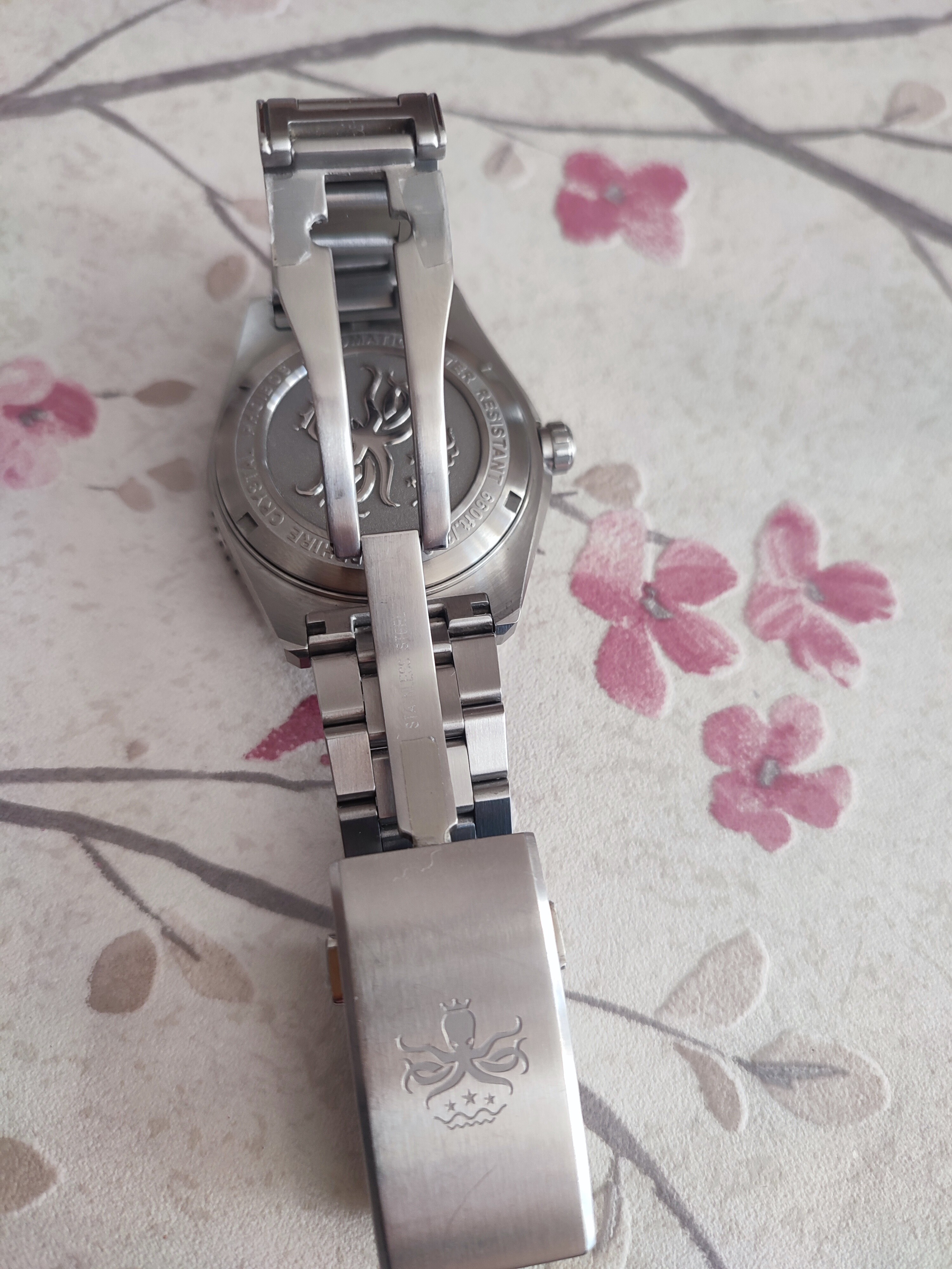 Con las características habituales de divers Phoibos, zafiro, muy buen lumen, antirreflejante, nh35, pasadores atornillados, 200 wr el pulpo en la trasera, corona y cierre con el logo.
