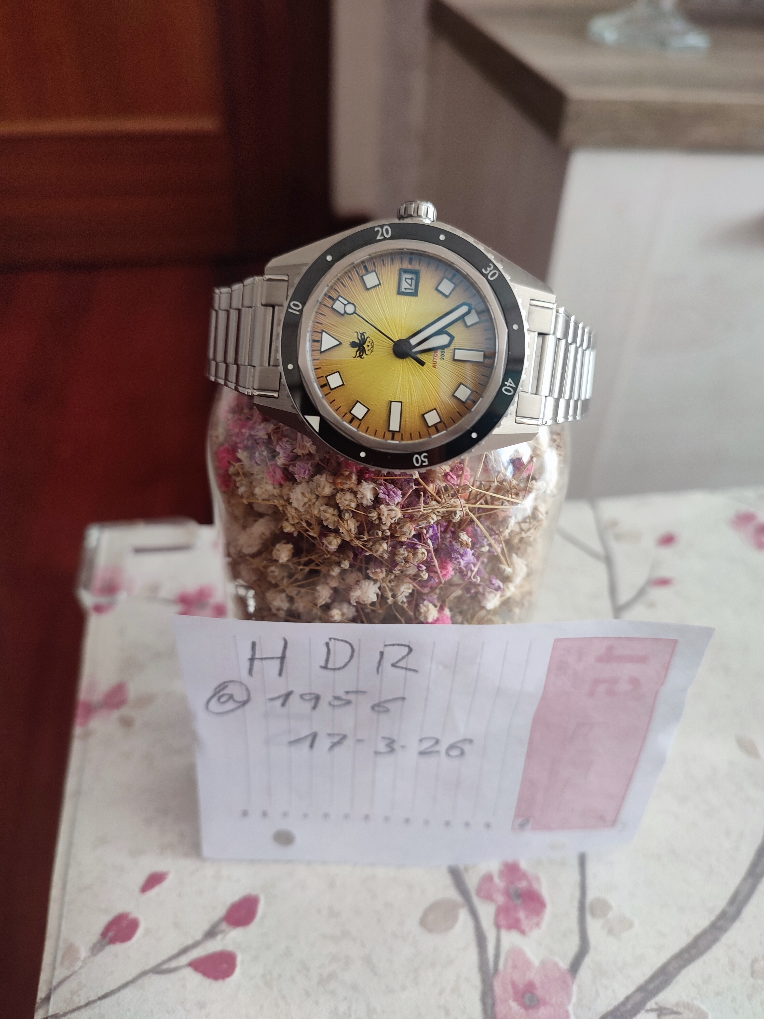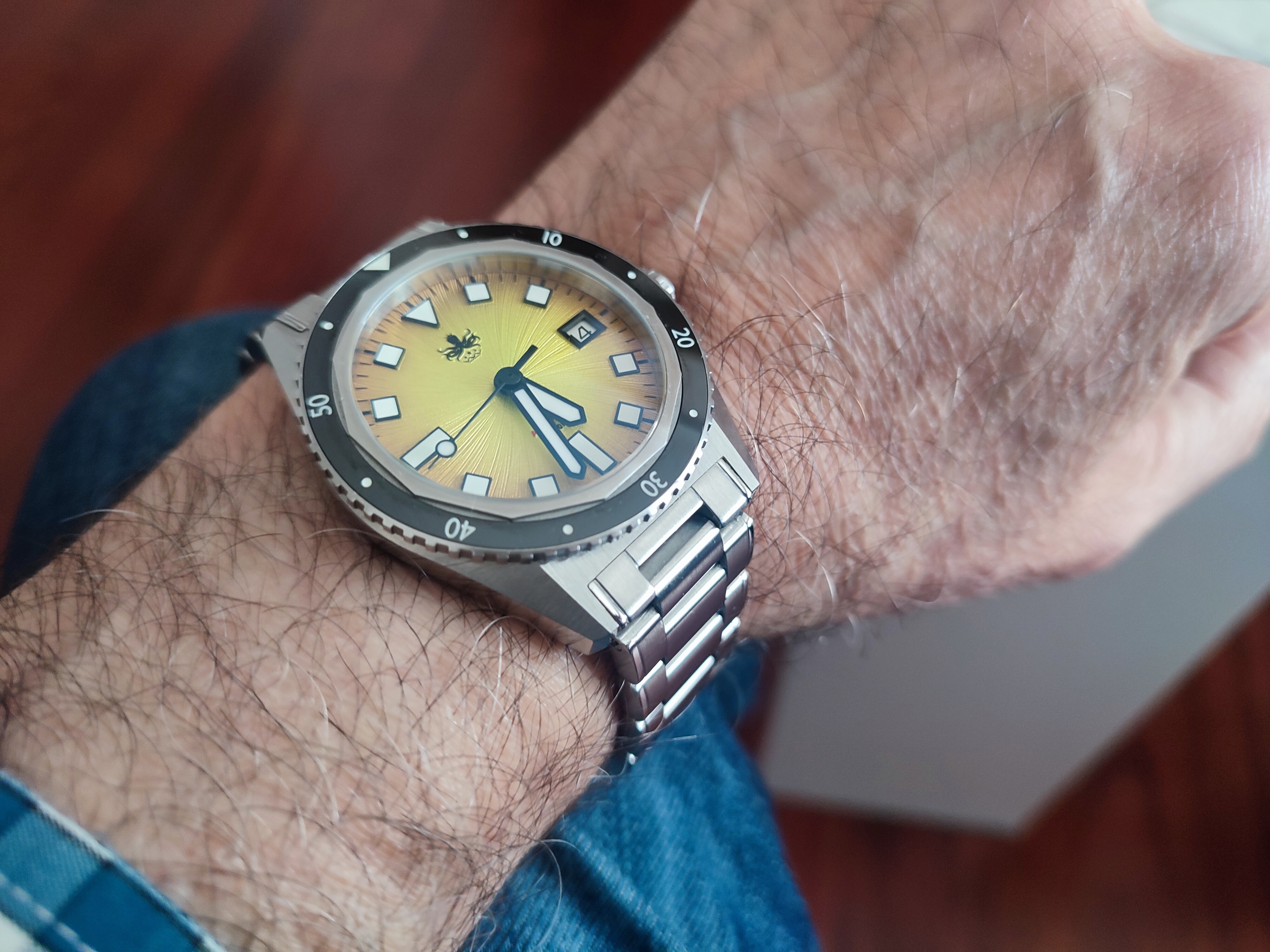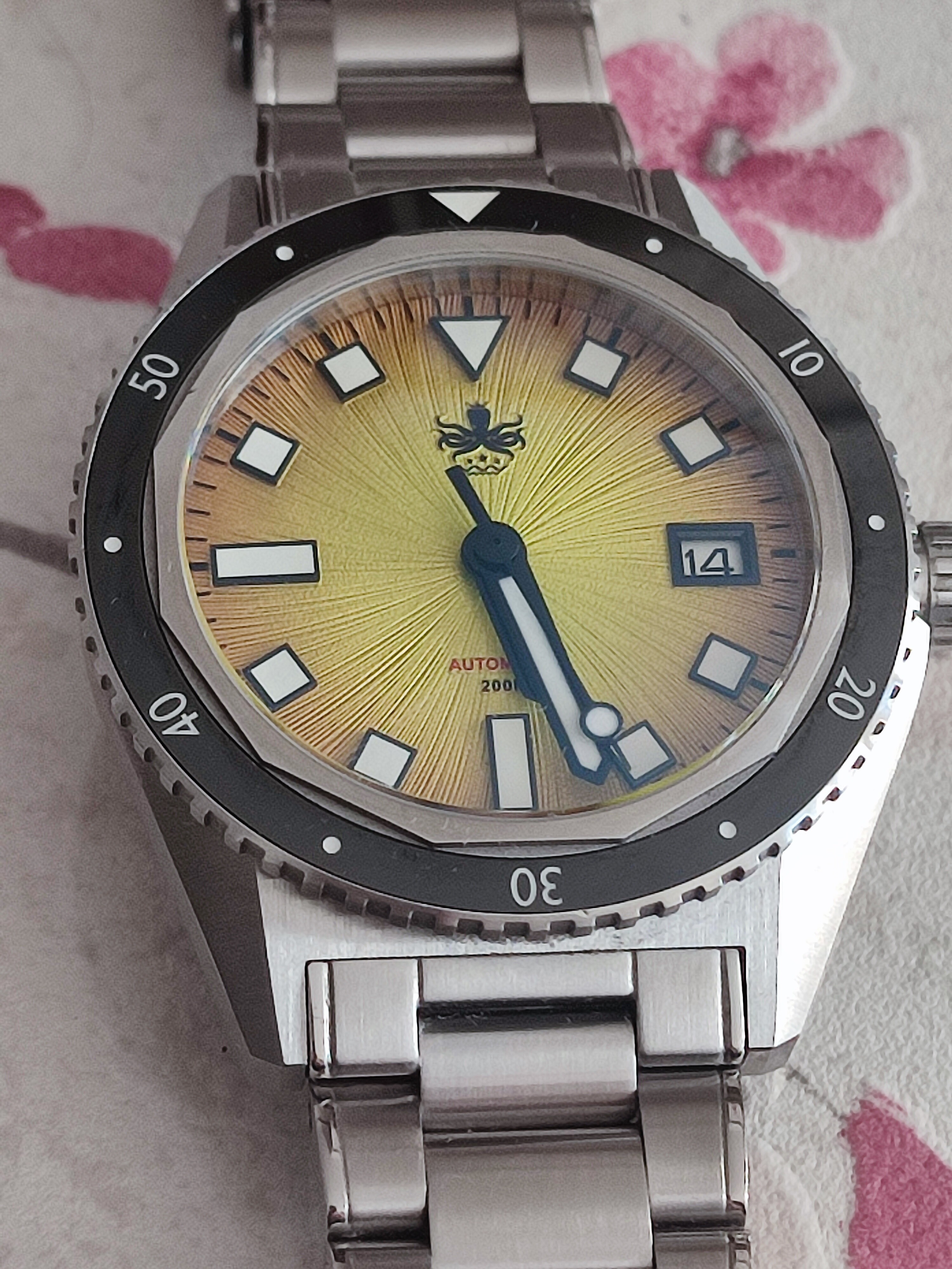 Con las características habituales de divers Phoibos, zafiro, muy buen lumen, antirreflejante, nh35, pasadores atornillados, 200 wr el pulpo en la trasera, corona y cierre con el logo.