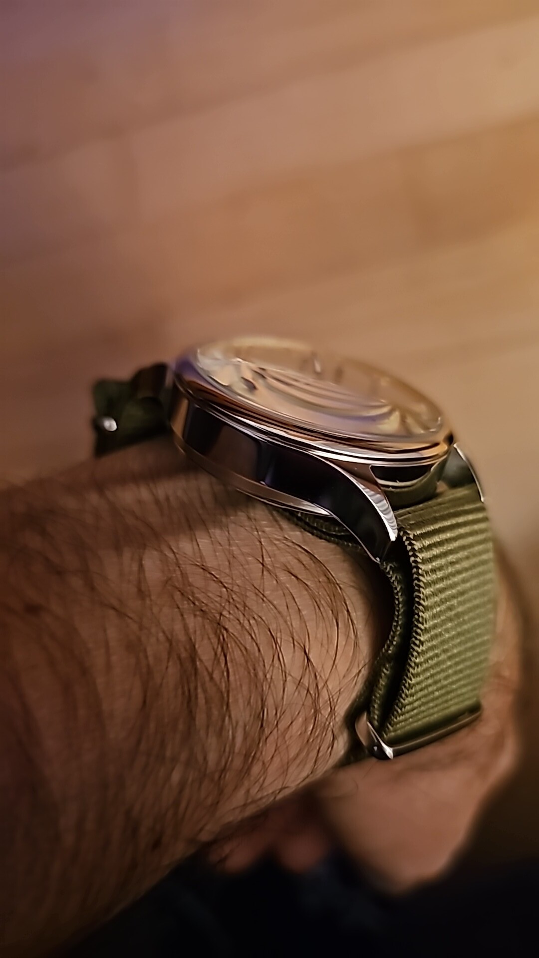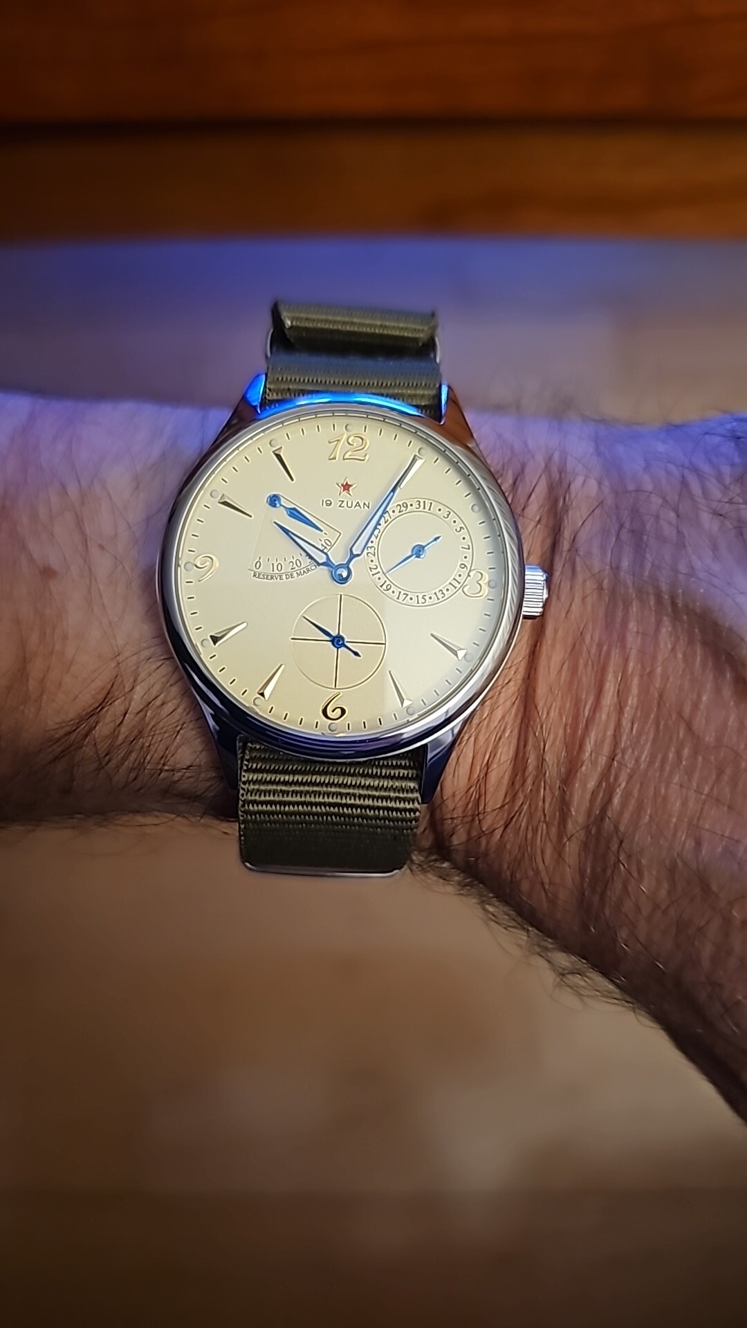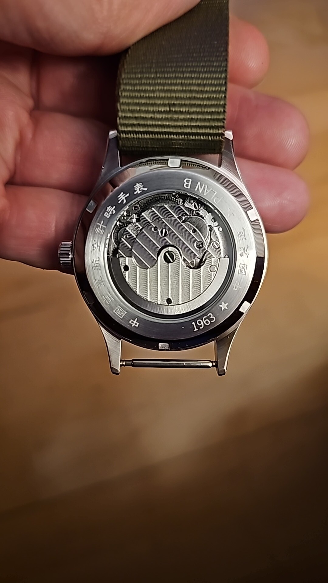 Saco a la venta este Red Star 1963 con movimiento ST17. 40mm, Dial champagne, tapa trasera vista, zafiro abombado y nato original verde.