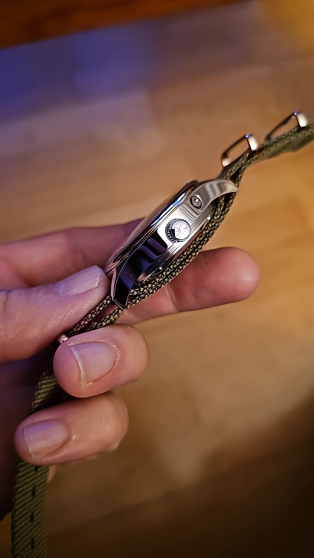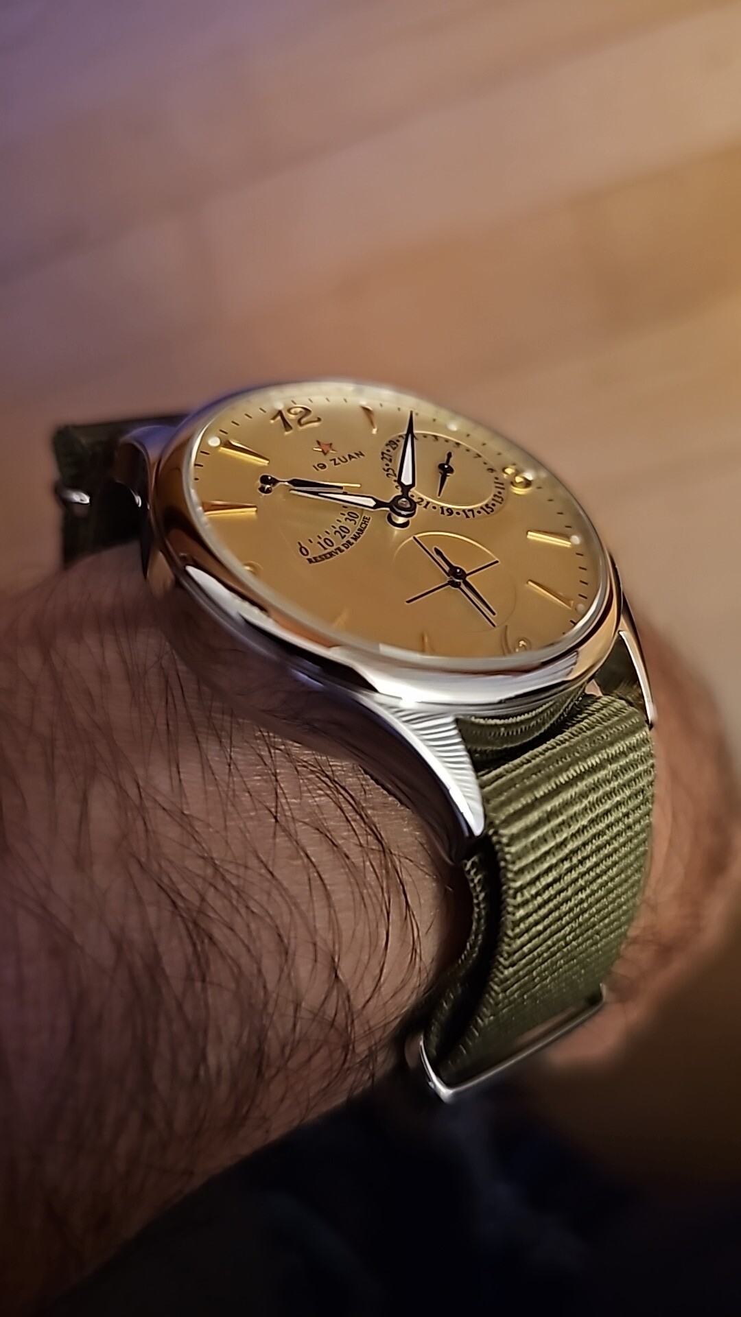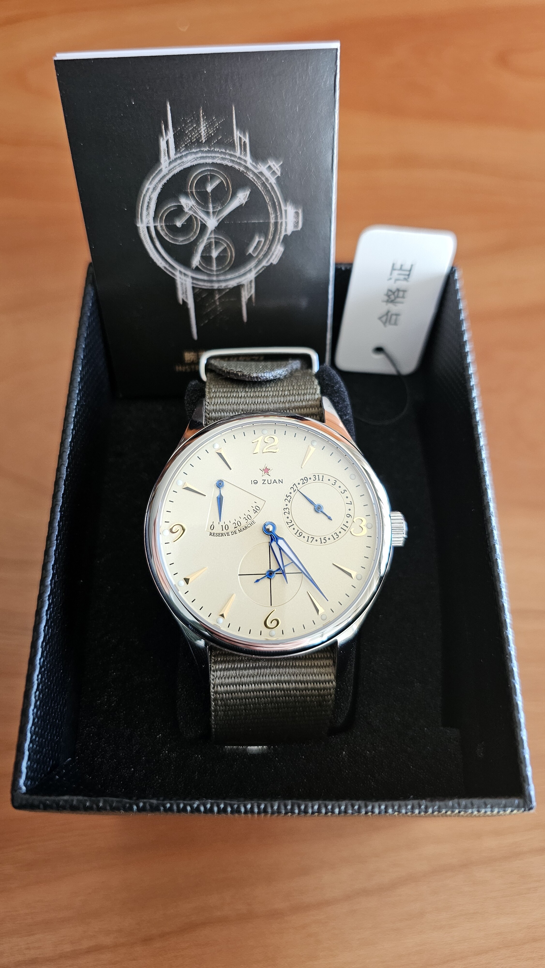 Saco a la venta este Red Star 1963 con movimiento ST17. 40mm, Dial champagne, tapa trasera vista, zafiro abombado y nato original verde.