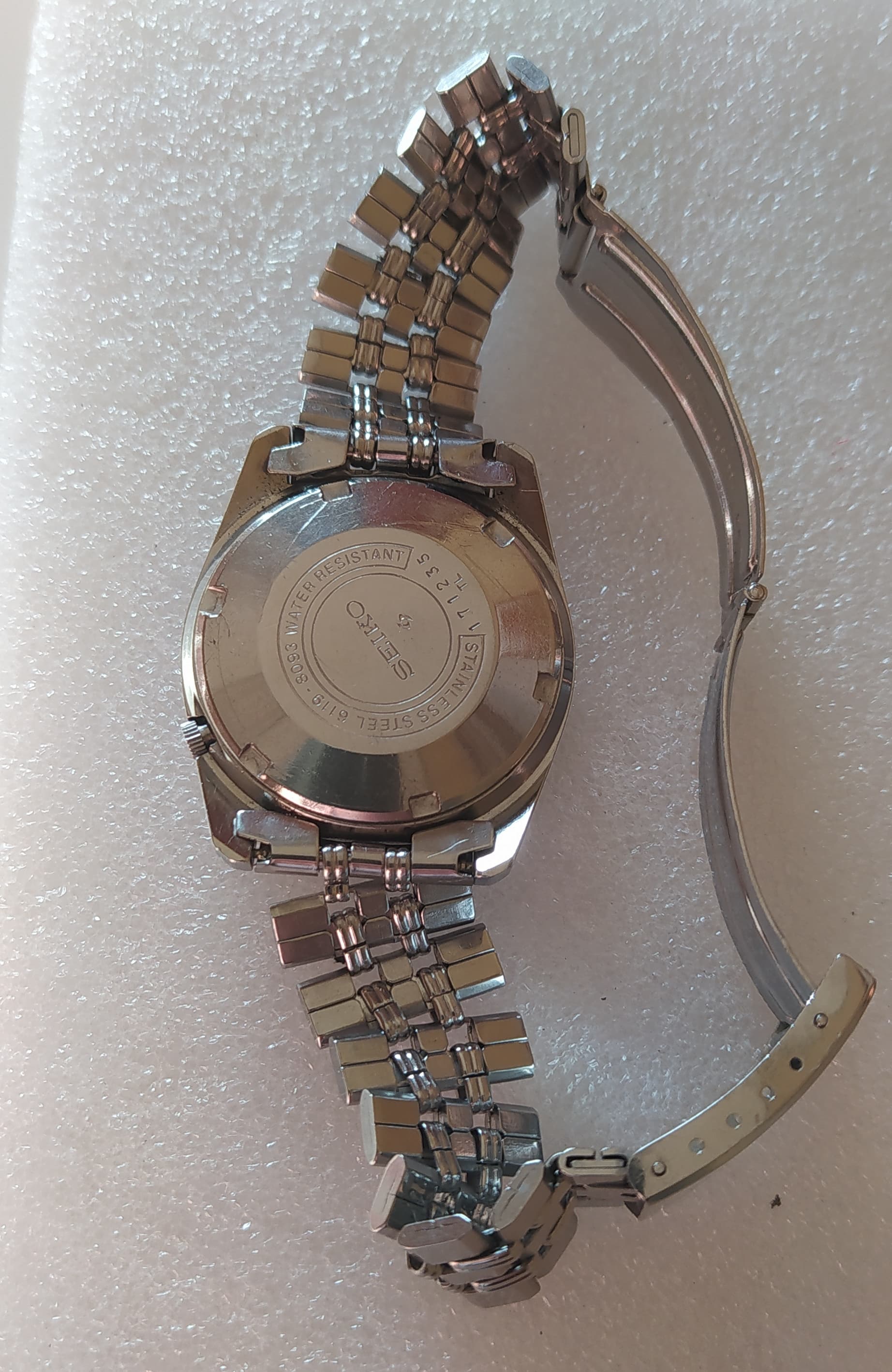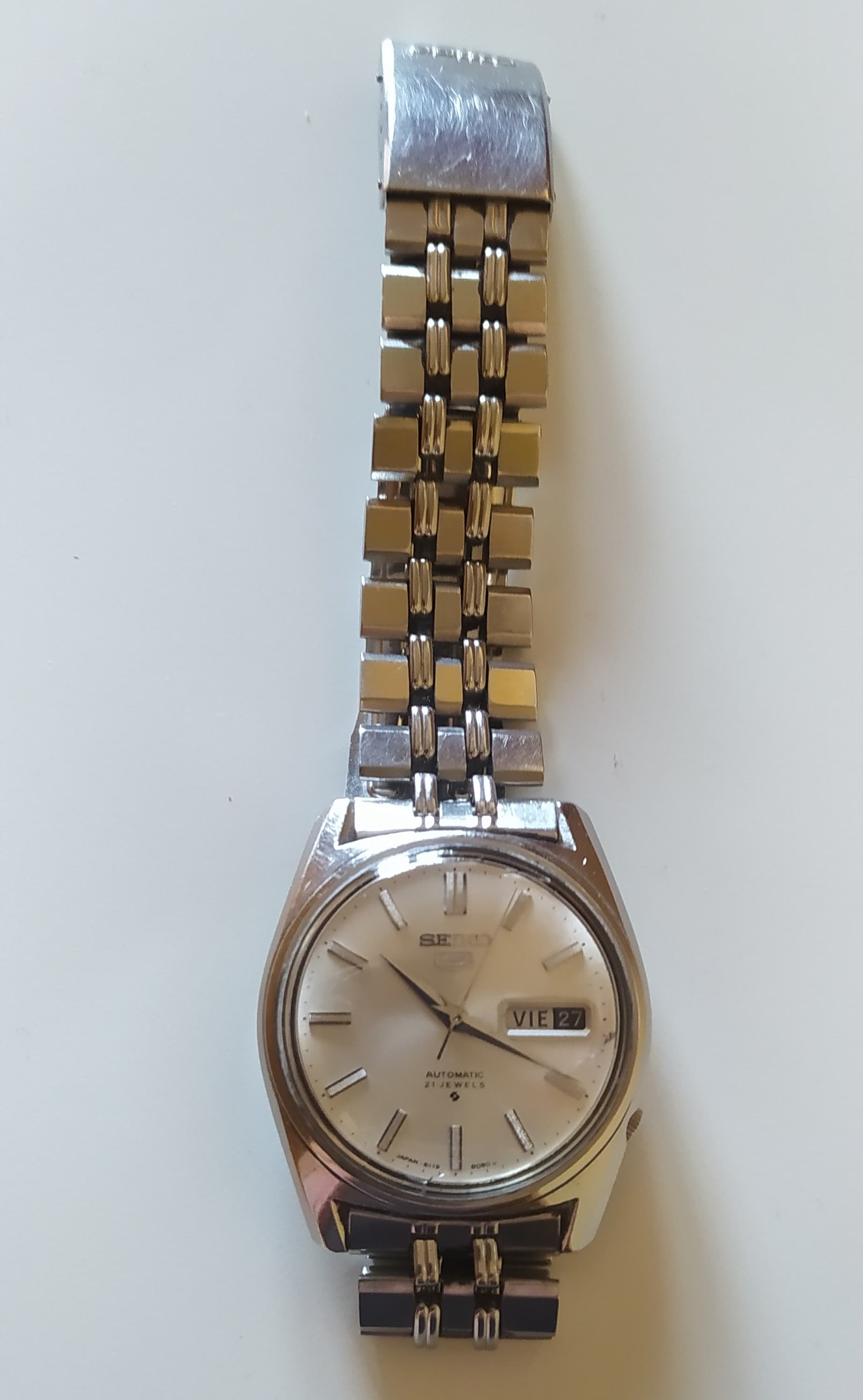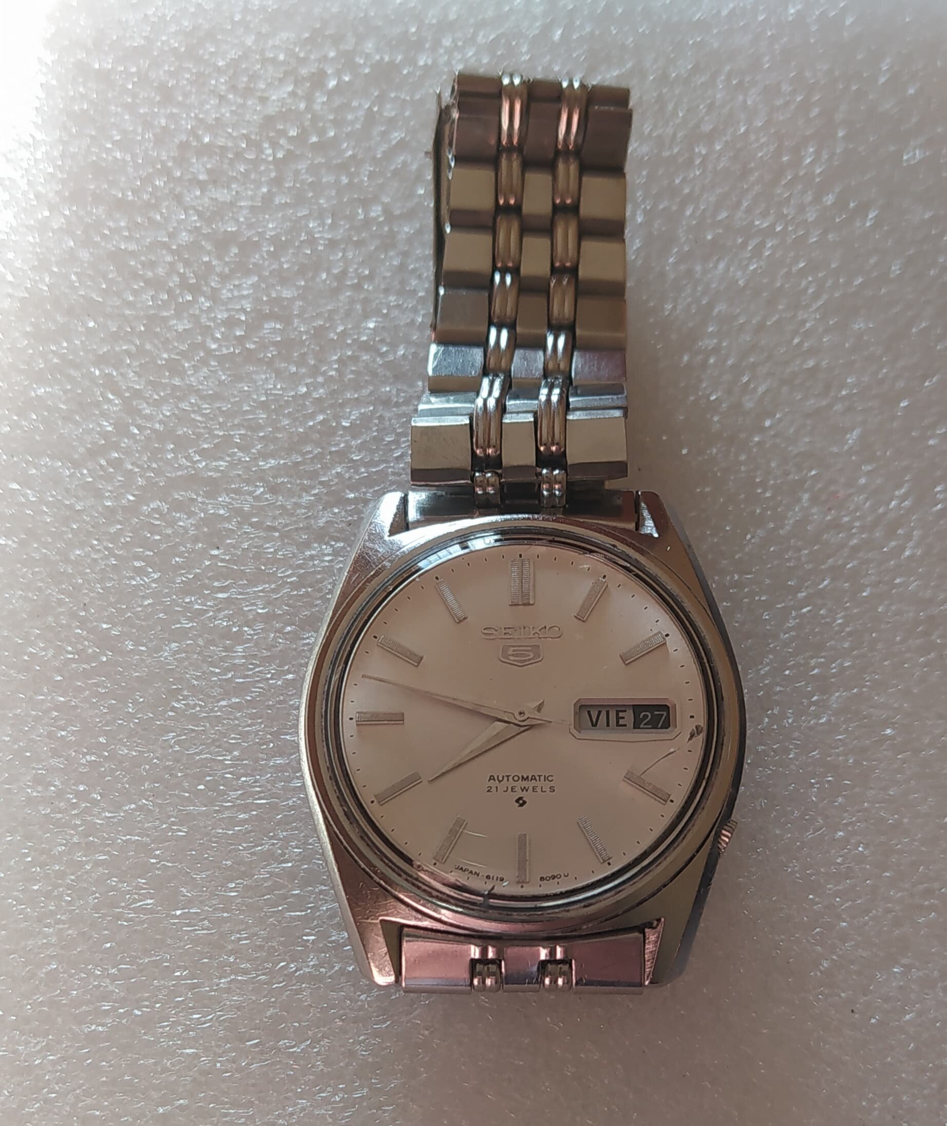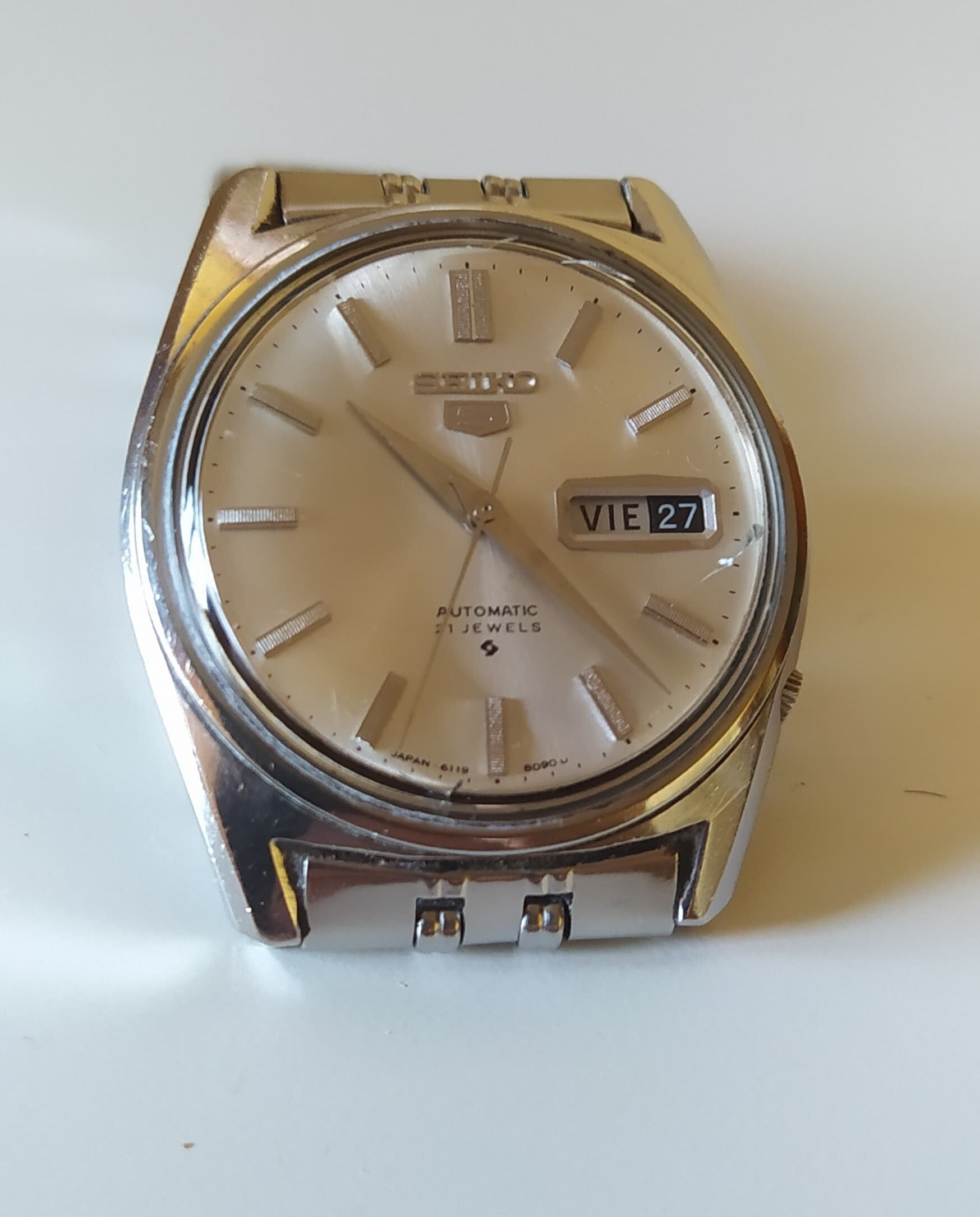 Saco a la venta otro reloj que no uso casi nada lleva tiempo sin salir de paseo se trata de un Seiko automático 21 jewels movimiento 6119 - 8093 el reloj funciona perfectamente y mantiene la hora y reservada marcha muy buena lo e usado un par de días enteros. lo que si quiero comentar que le haría falta una revisión pues en los 6 años que yo lo e tenido no le e echo ninguna y cuando lo compre pues no sé cuando le harían la última el antiguo propietario la corona está un pelín doblada y el plexiglás tiene alguna señal entre las 12 y la 1 y las 3 y las 4 a mí no me han molestado pero habrá quien no le guste y lo quiera cambiar lleva su armix original con cierre firmado.