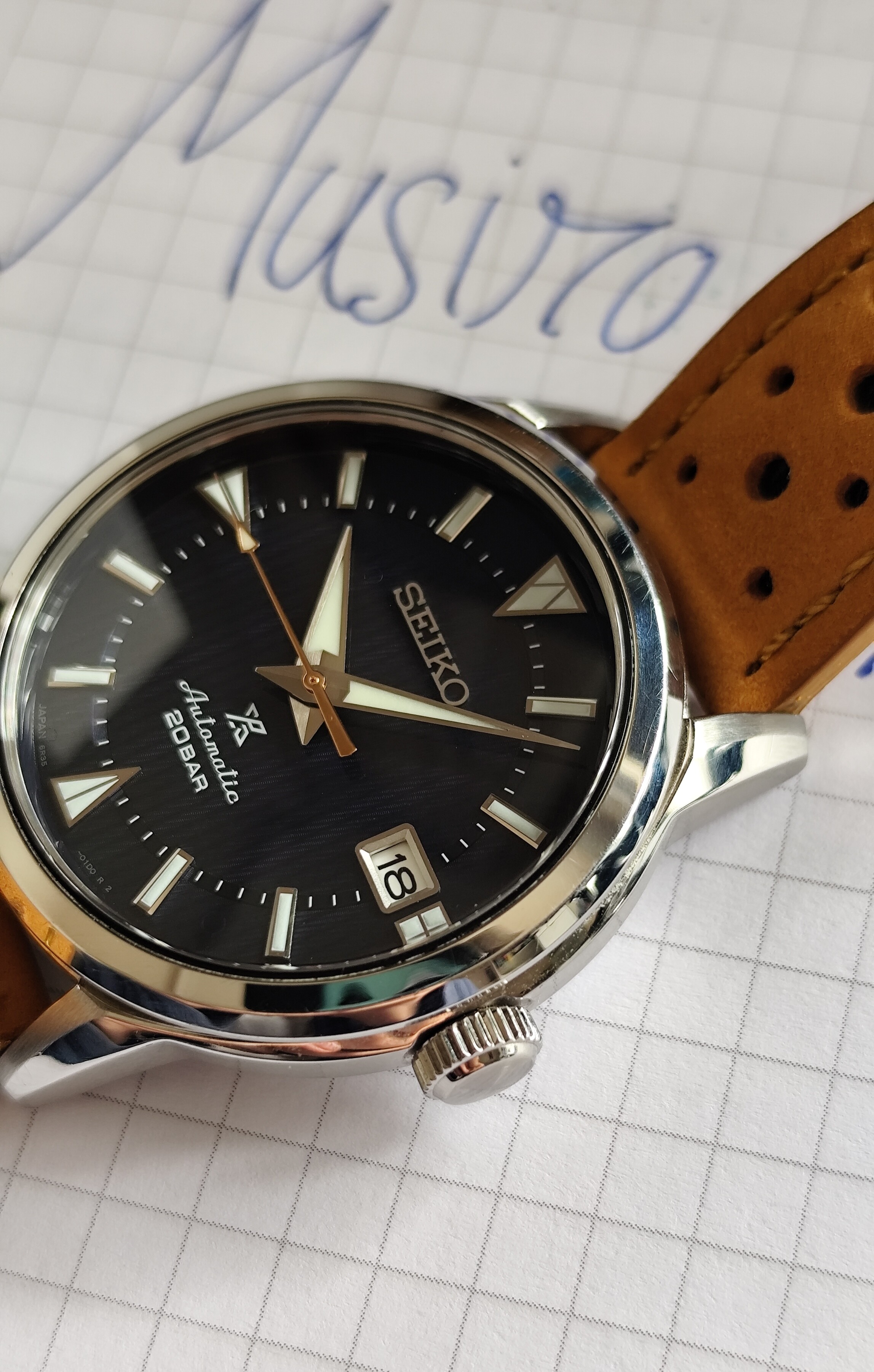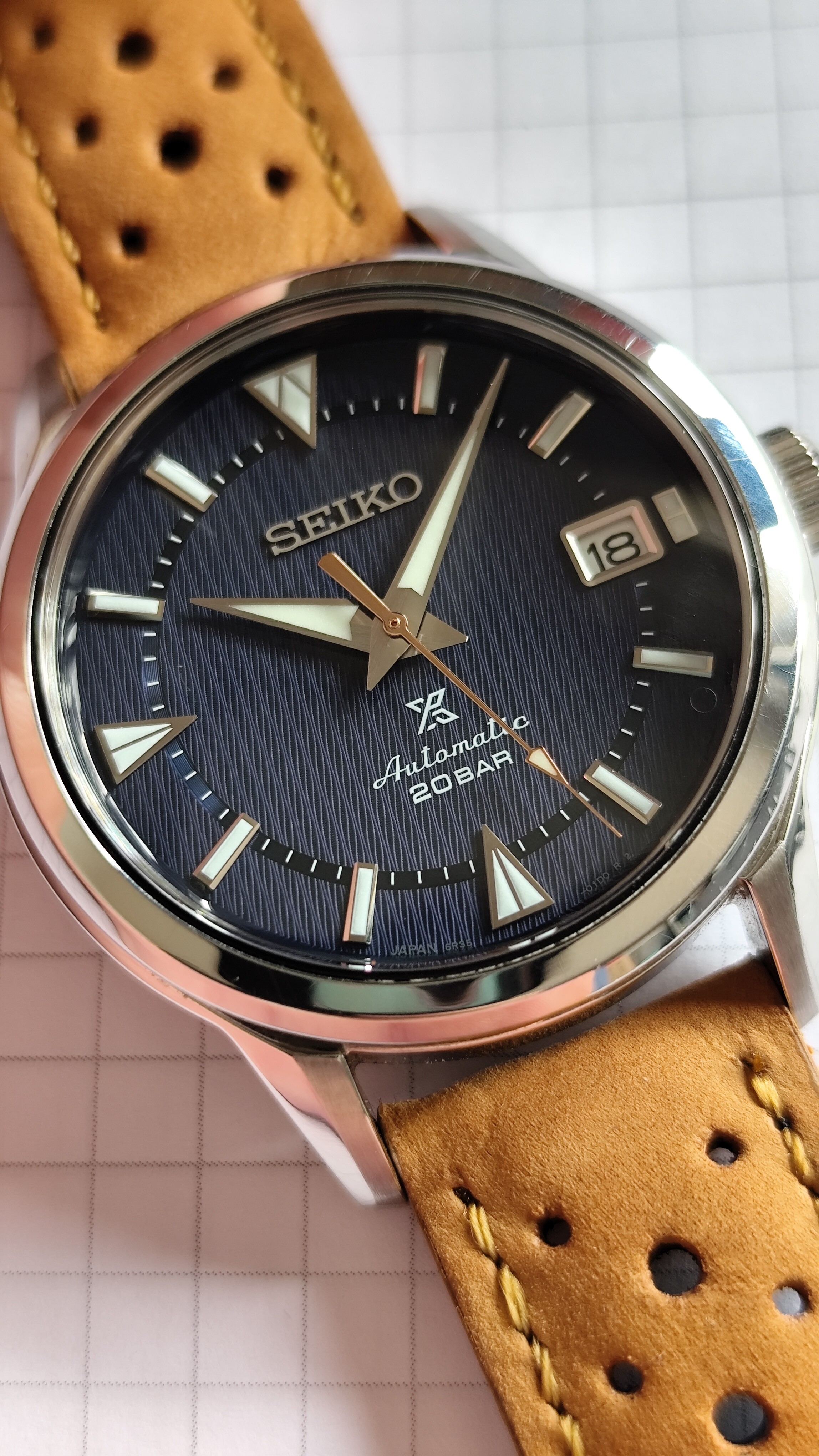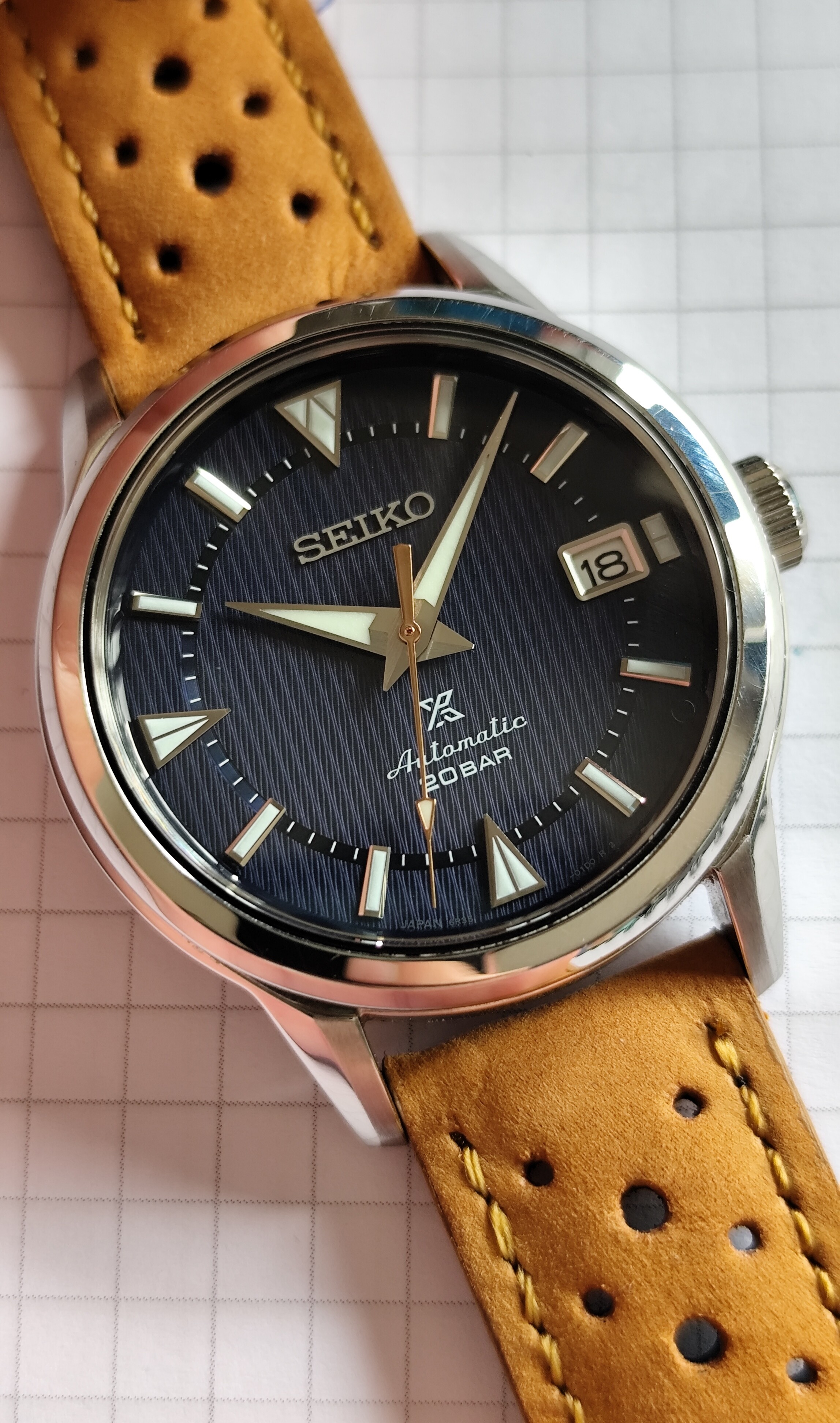 Seiko Alpinist, made in Japan, recreación del original de 1959, esta versión azul es conocida como Deep Lake y tiene un dial con patrón de sutiles lazos/nudos verticales.