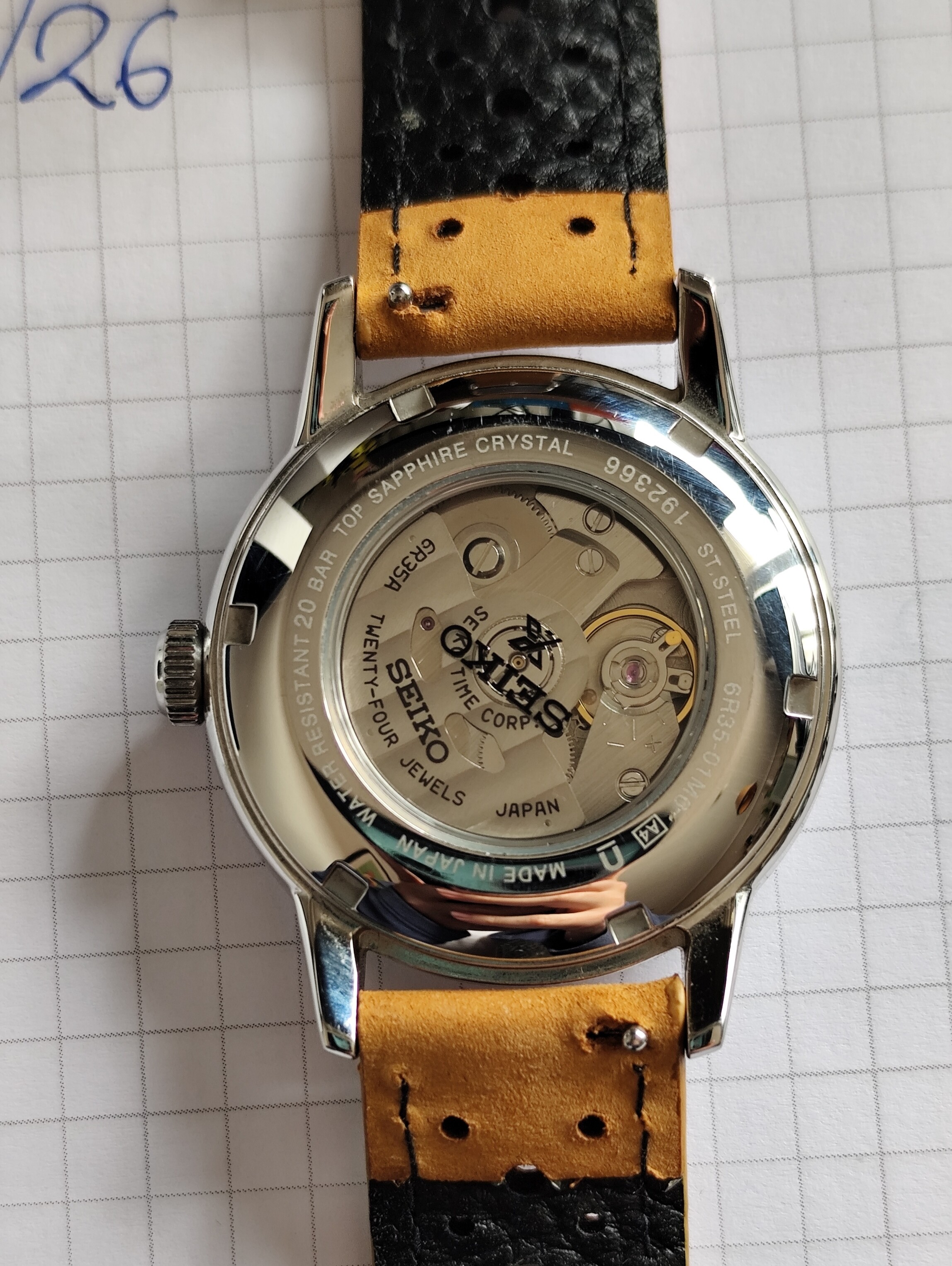 Caja de 39mm, cristal de zafiro y 20bar de resistencia al agua, L2L de 19mm y grosor de 13mm.