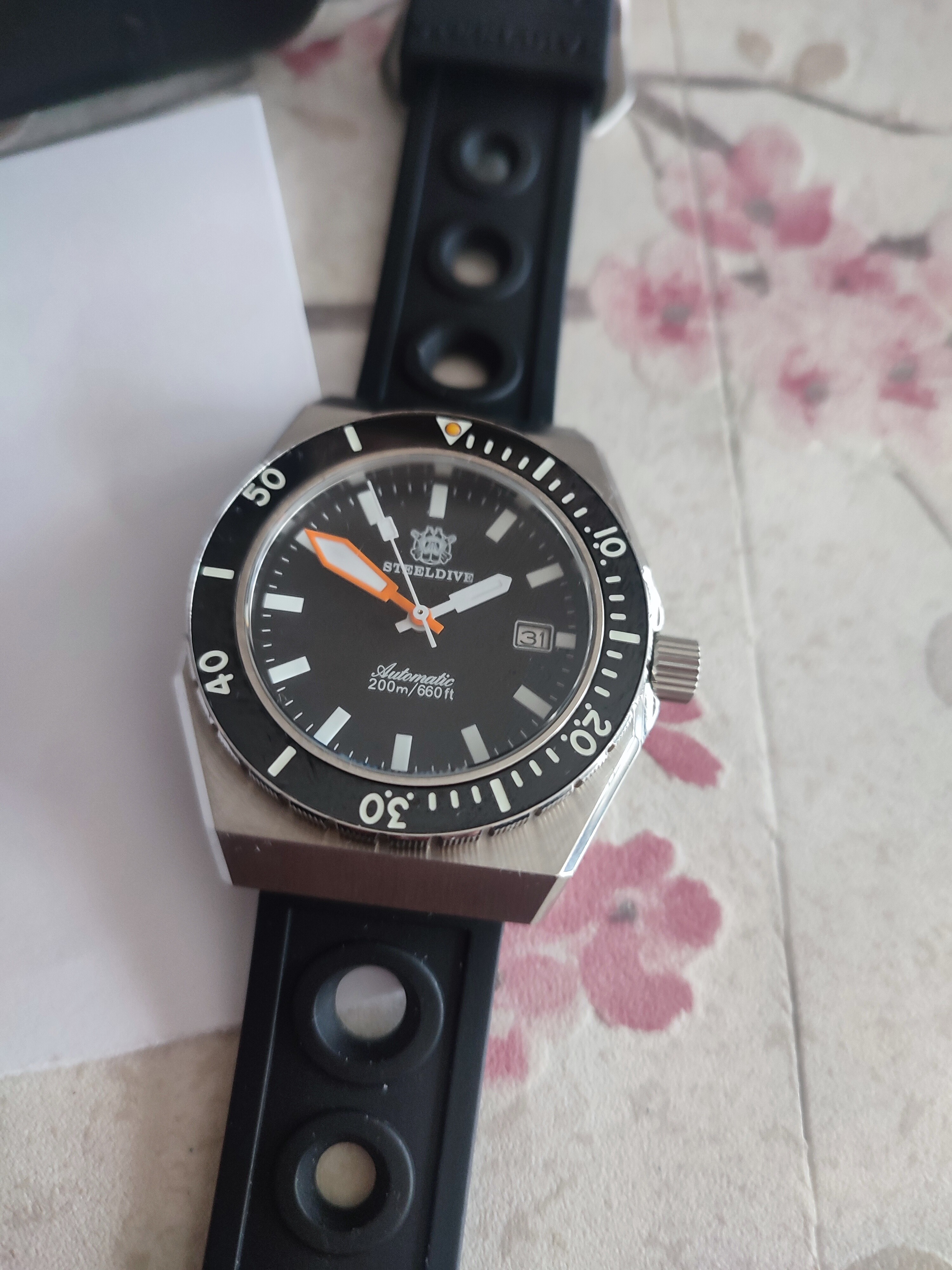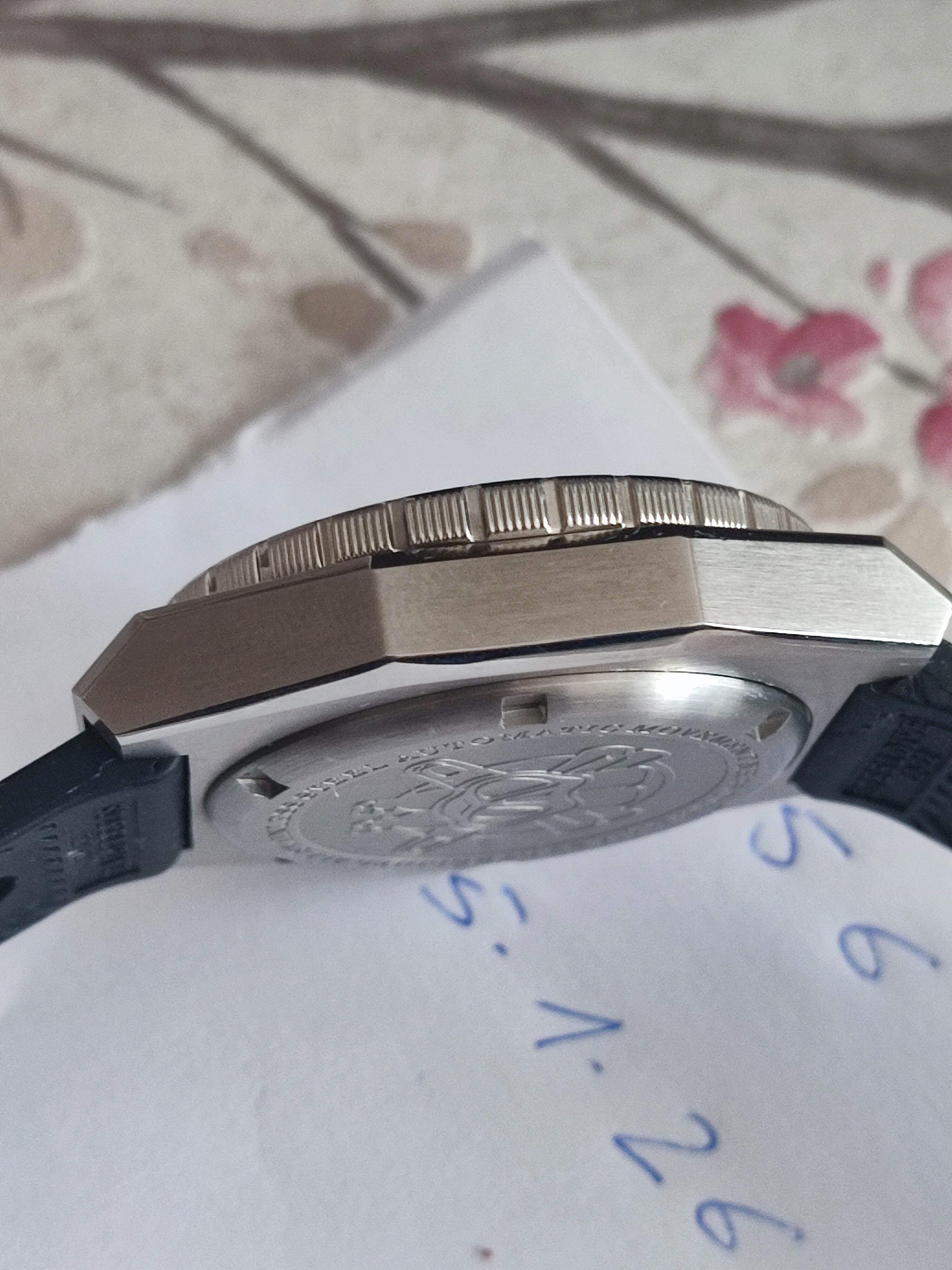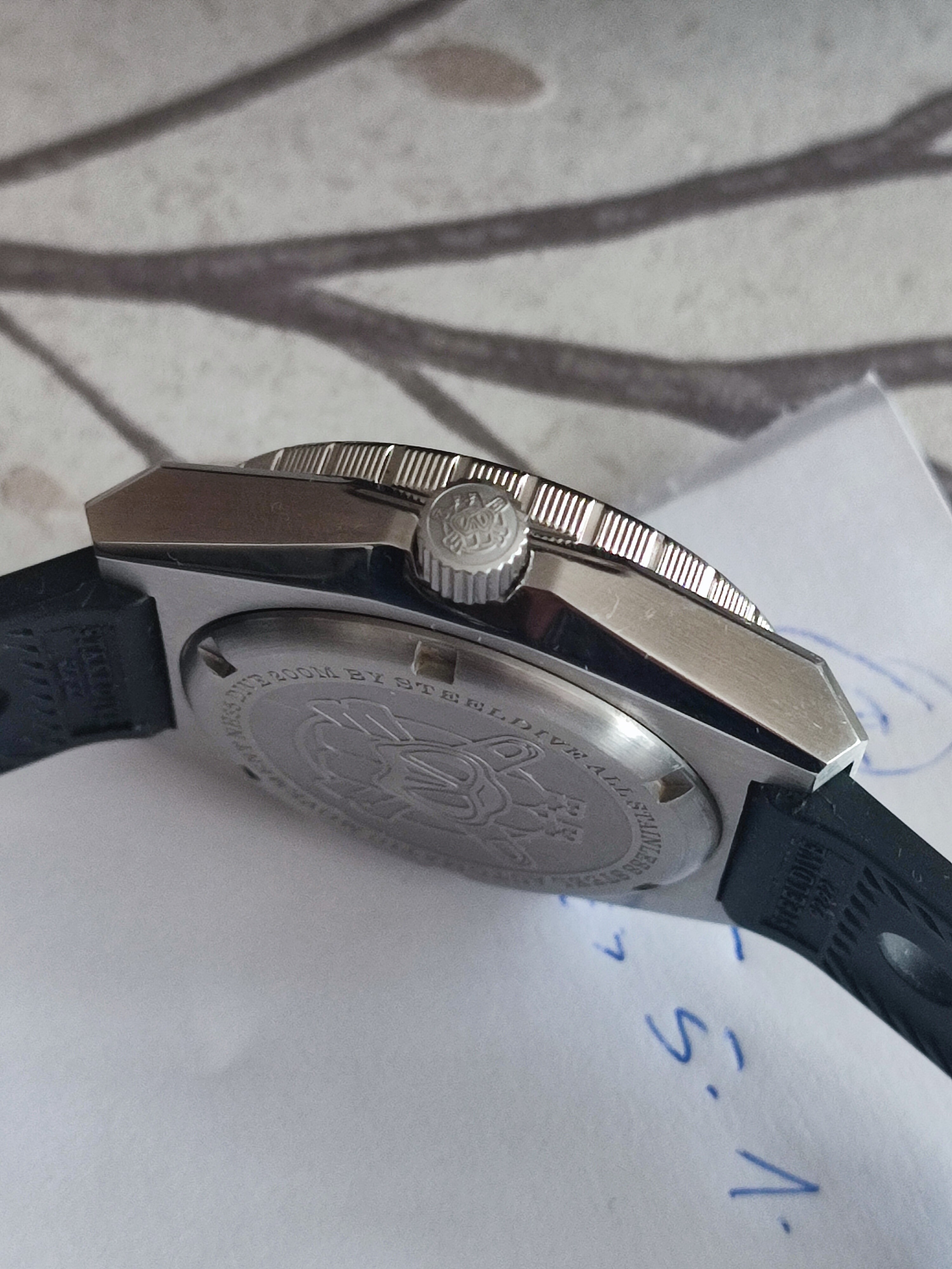 Hola buenos días, pues nada pongo a disposición de todos vosotros este reloj que lo he adquirido recientemente a un compañero del foro y que no me hago con él, es anguloso y masculino, resistencia de 200 metros,lleva zafiro NH correa de goma con logo en la hebilla, bisel cerámico de 120 click, superluminova en índices manecillas y bisel, fondo roscado con una roscada con logo.