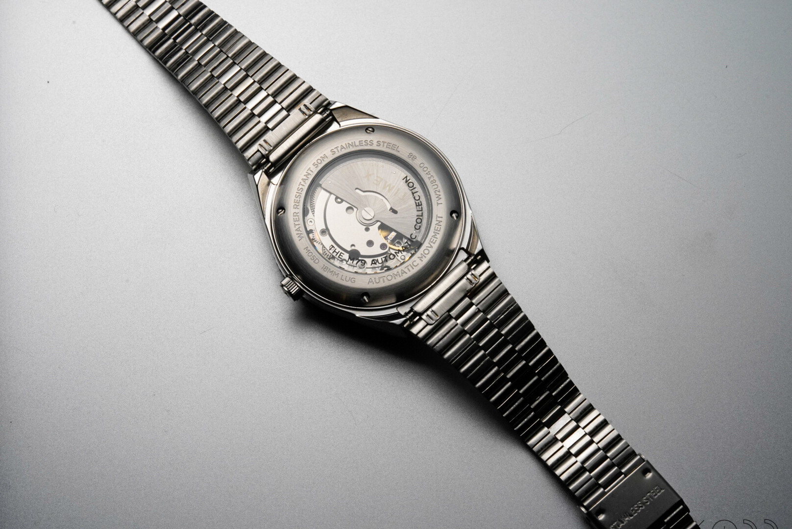 Tiene 40mm de ancho y 14,5mm de alto con cristal de plexi y movimiento automático miyota.