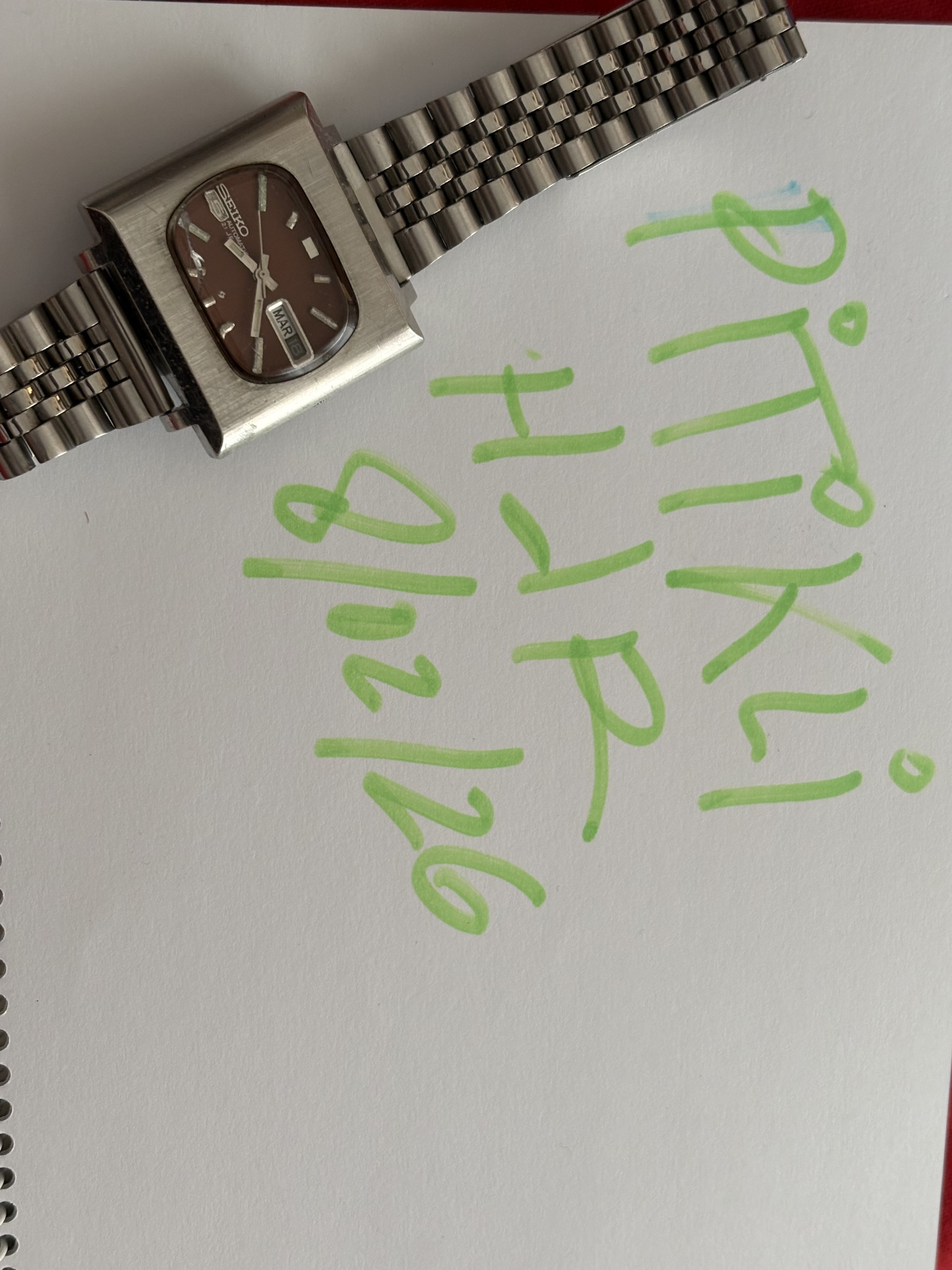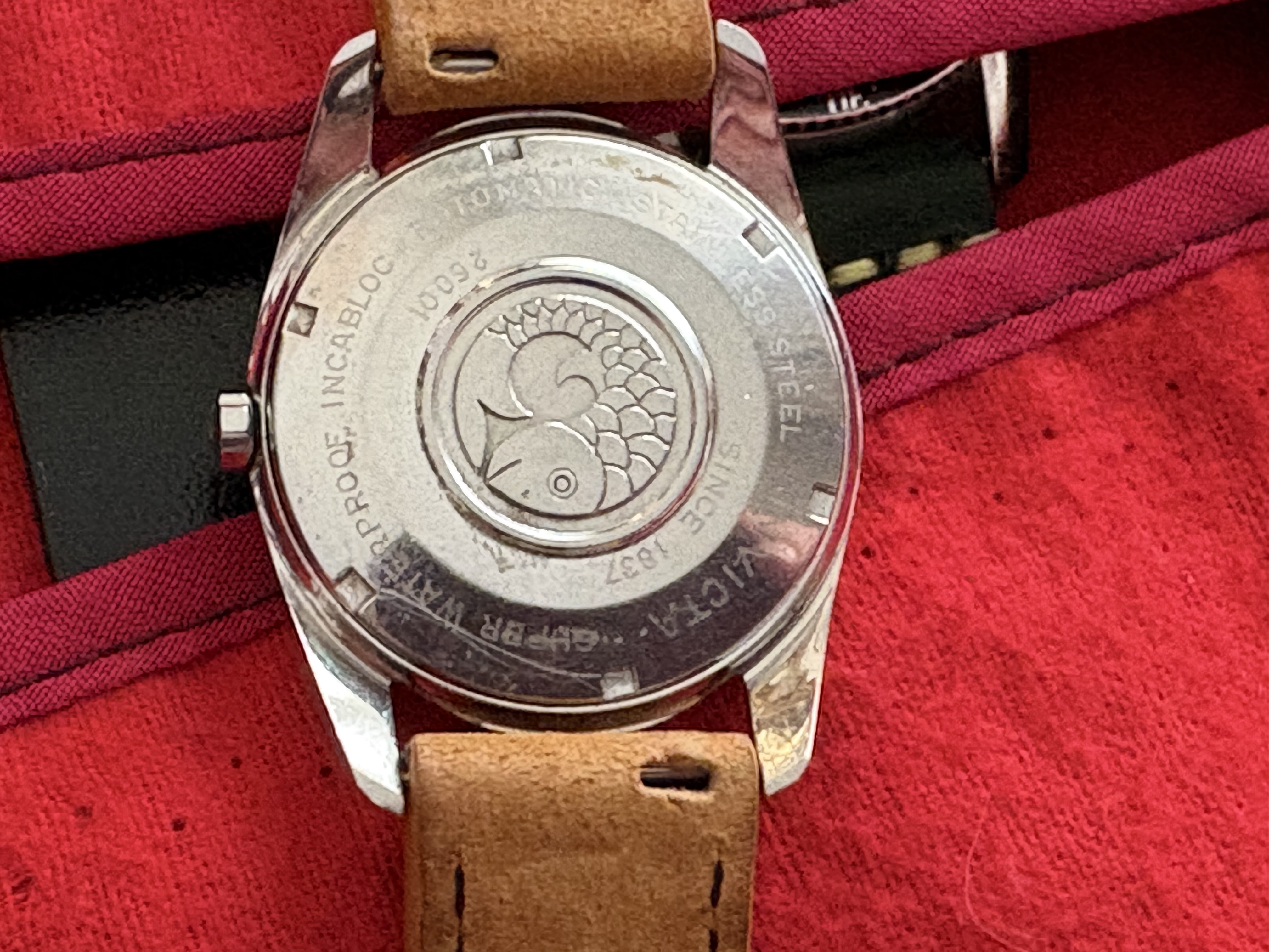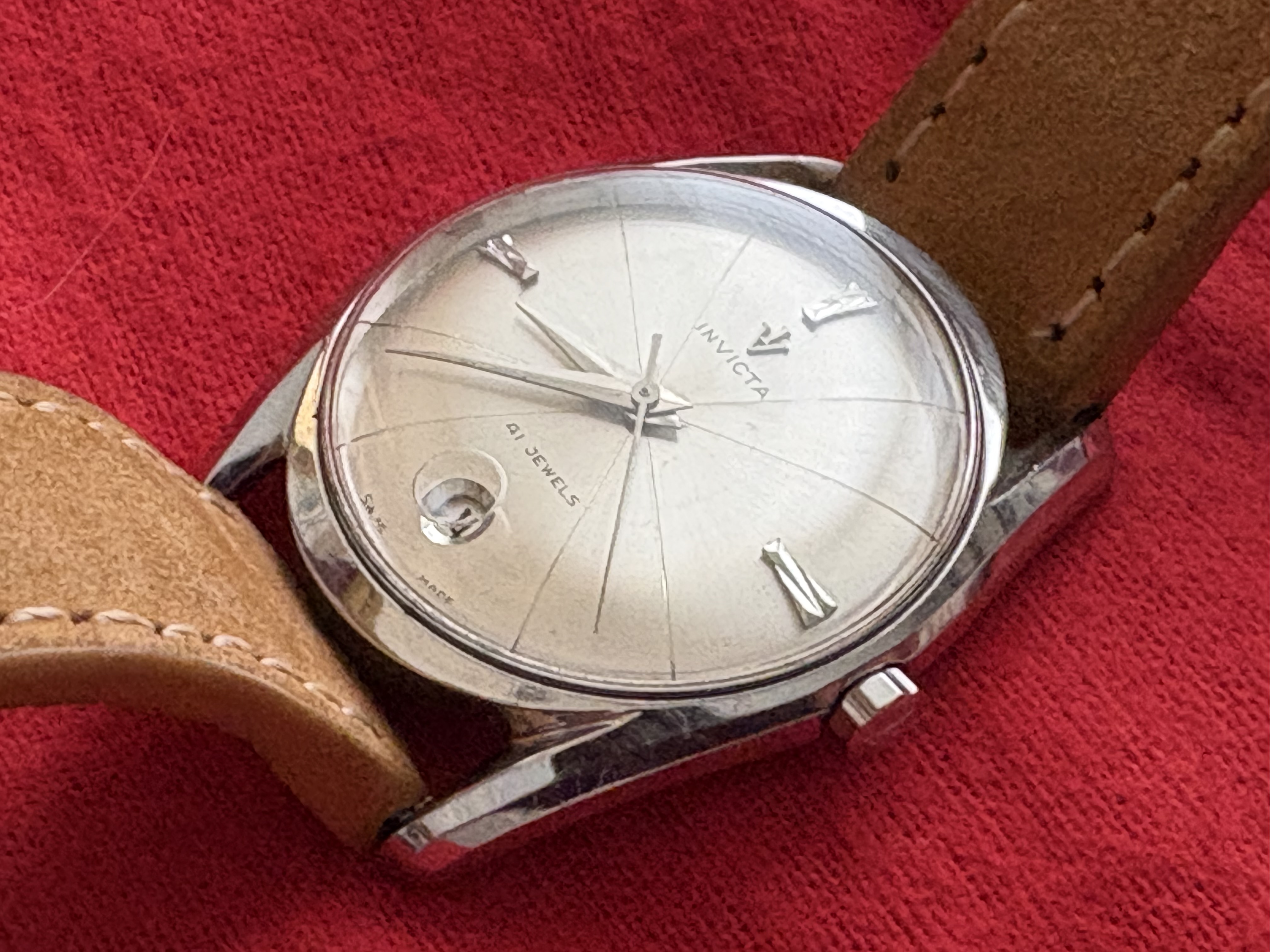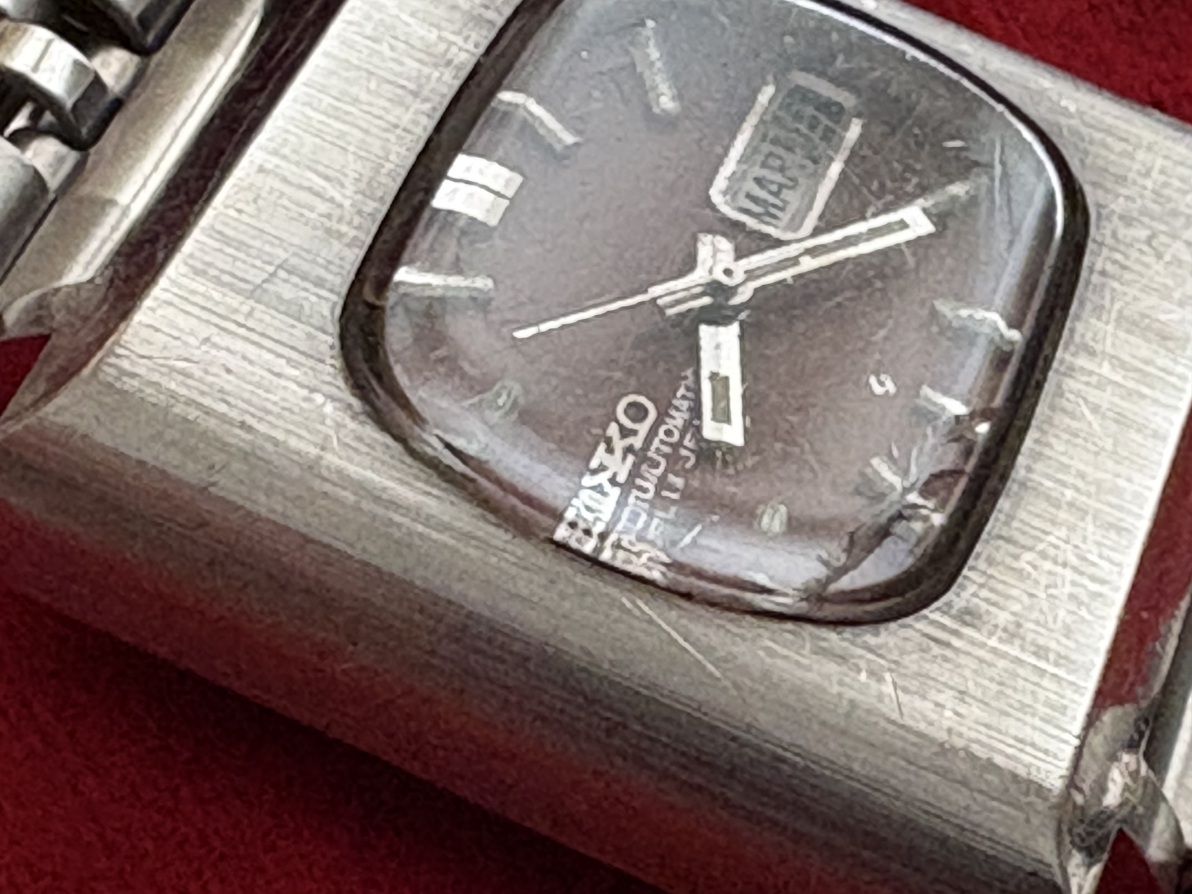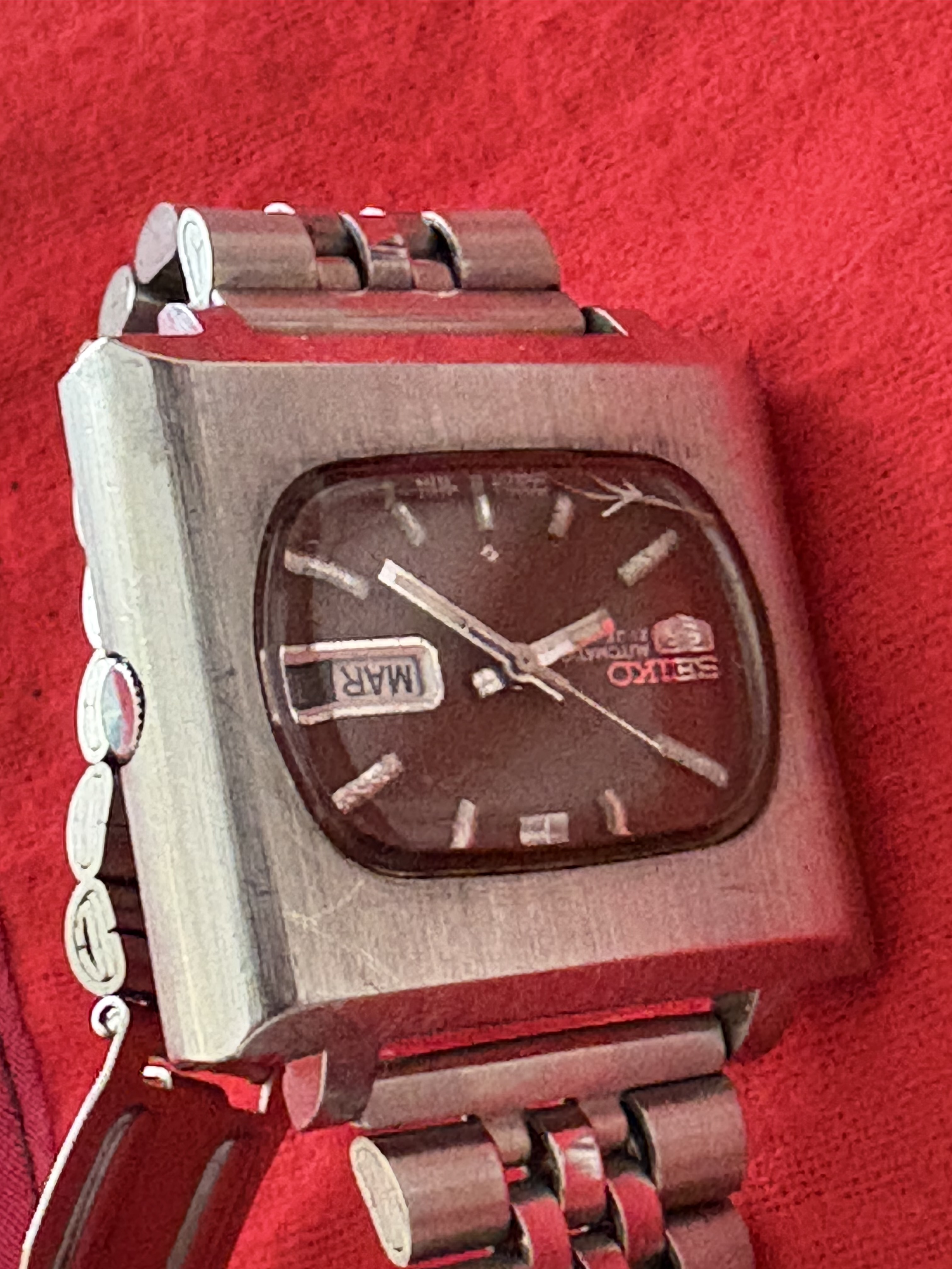 el mismo modelo TV , pero esfera burdeos . Funcionando igual de bien que el anterior. Este con brazalete jubilé ( en ambos casos van a dar hasta 18-18,5 cm de muñeca). A este hay que reseñarle una pequeña grieta por la cara interna del cristal . No se nota cuando tocas por fuera nada, y sin afectar a la legibilidad. Es más, hay ángulos en los que ni se aprecia. PVP: 130€.