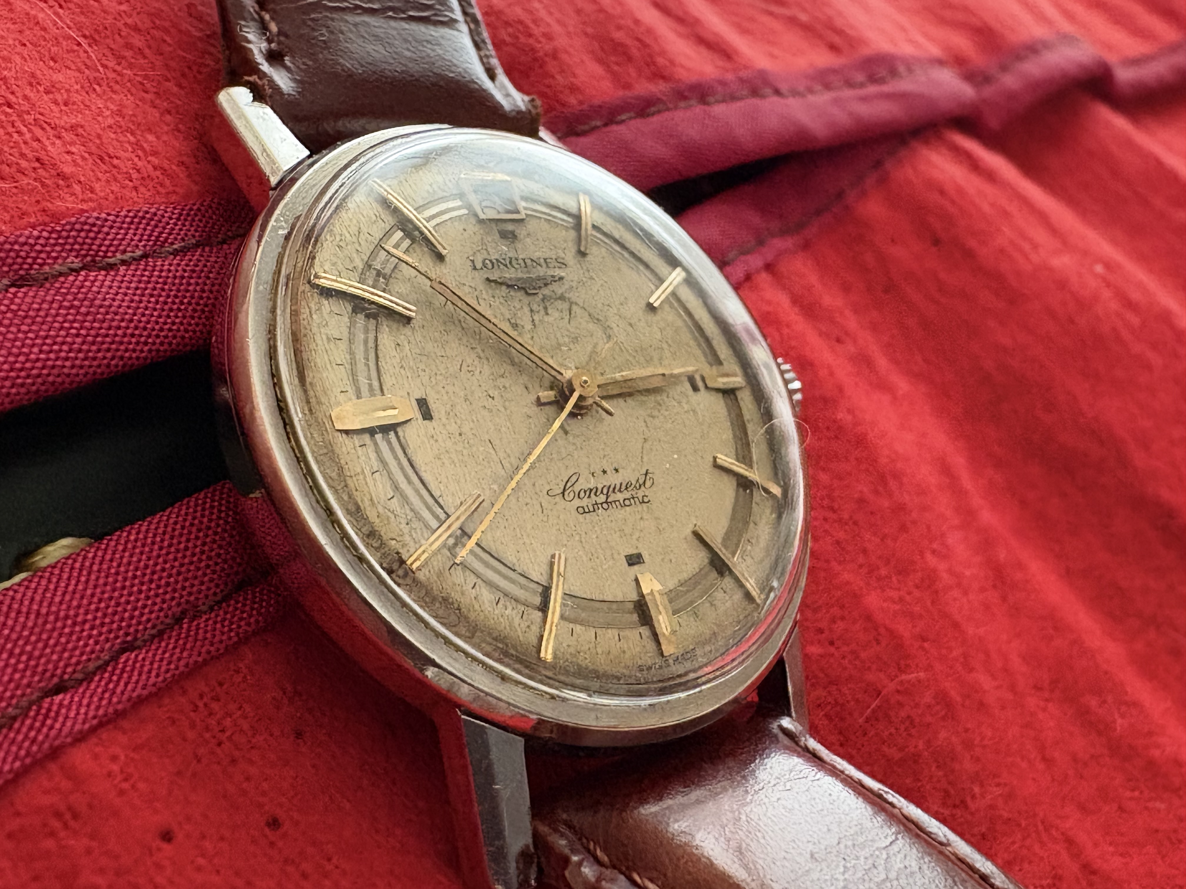 Longines conquest años 70. Poco que decir de este modelo. Precioso , patina muy bonita. Muy bien conservado. Se perdió la chapa redonda de atrás con detalles en oro, de ahí el precio 350€.35mm SC pero el L2L hace que quede bien en cualquier muñeca.