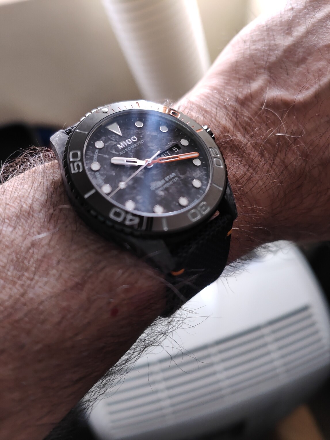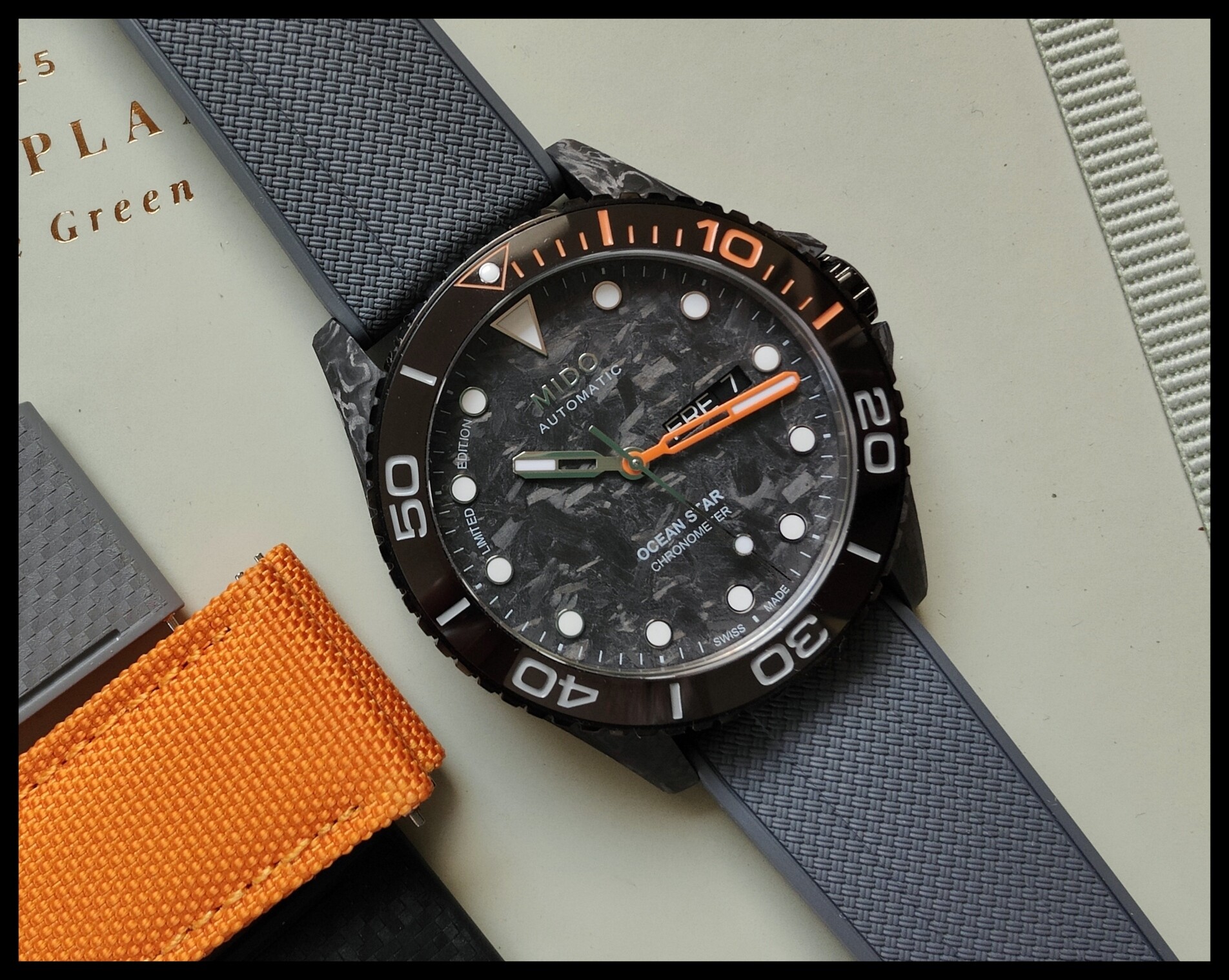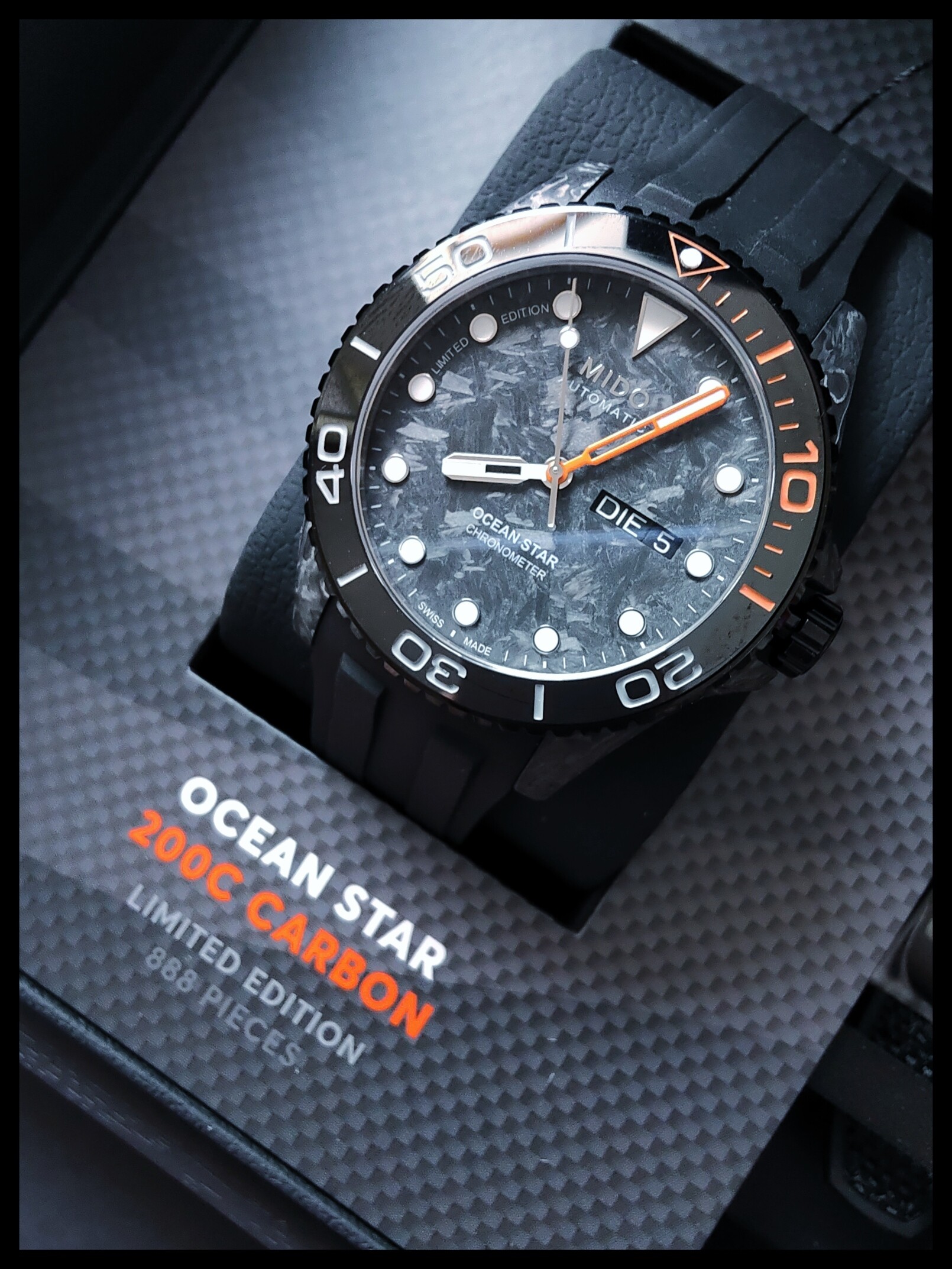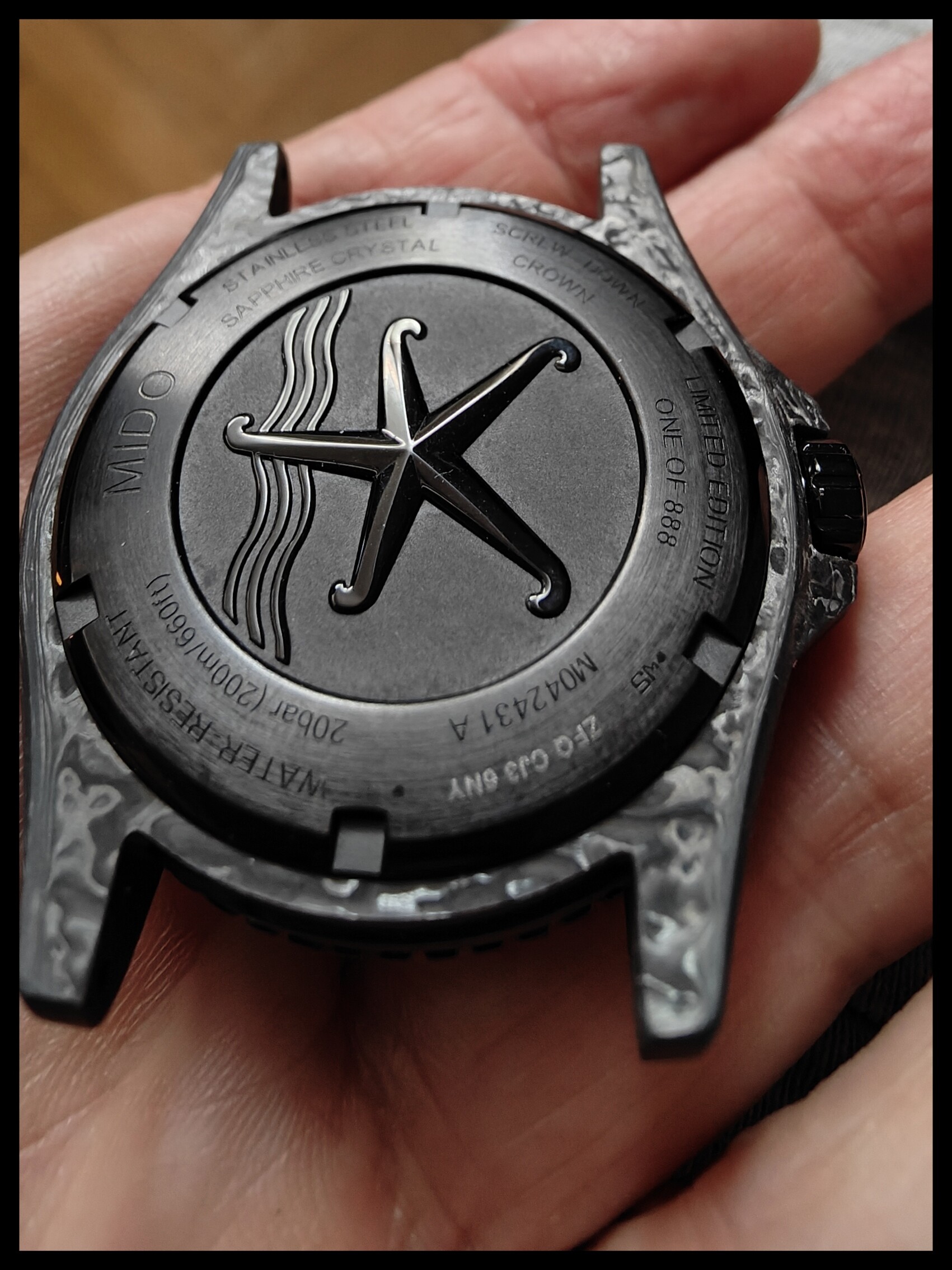 El mio es un MIDO cronometro pero creo que descontinuado, de todos los que vi fue el que mas megusto, dentro de mi rango de precios claro. Tiene una caja interna de acero inoxidable y el carbono forjado rodea dicha caja., La tapa trasera es titanio