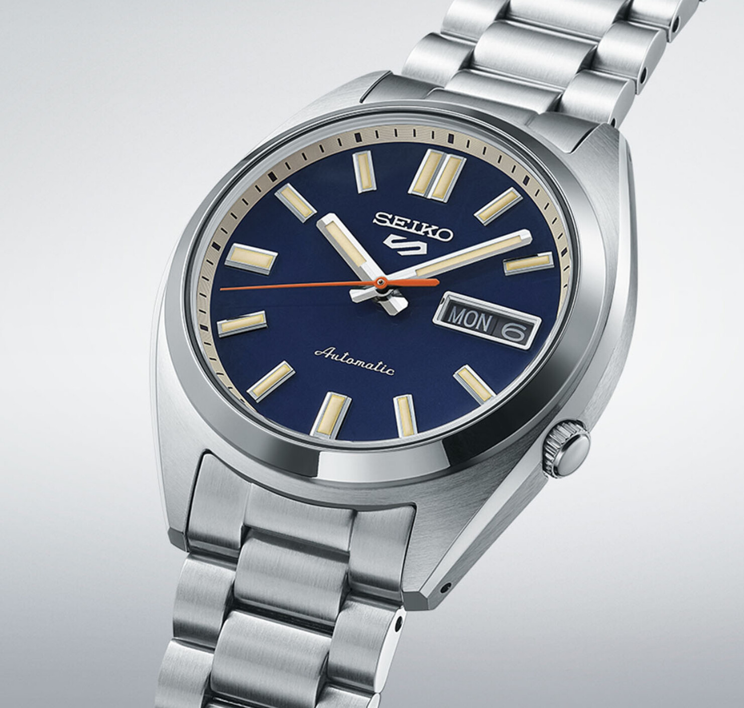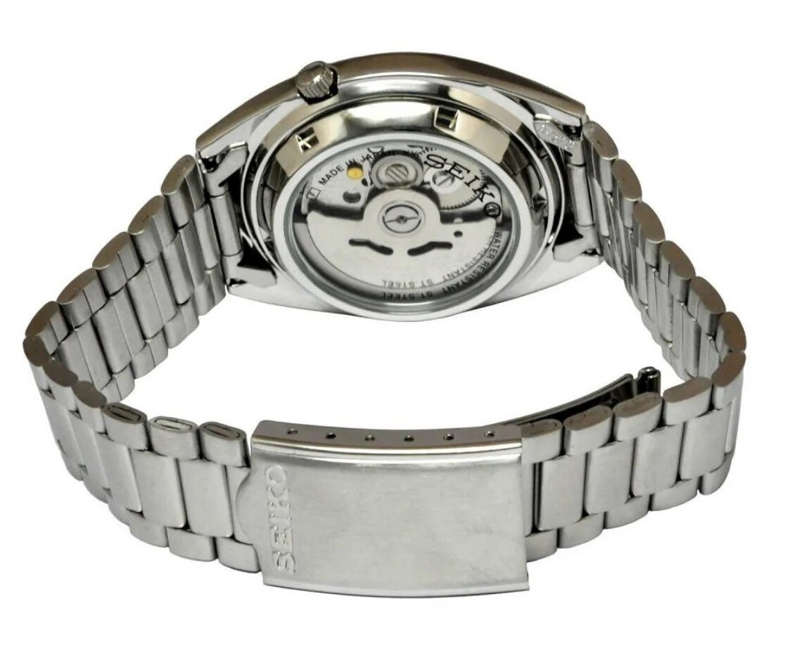 El viejo. Calibre 7S viejo, con precisión dudosa, sin parada de segundero ni carga manual. Brazalete con end-links de chapas, eslabones de chapa doblada y un cierre básico.