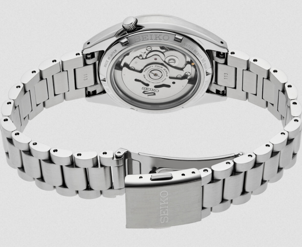 Calibre 4R que te irá mucho mejor afinado. Tapa trasera mejor terminada. Y, sobre todo, un brazalete de verdad, con un cierre de verdad de pulsadores. Mira el canto de los eslabones y compáralos con los del modelo viejo, hechos de chapa doblada.