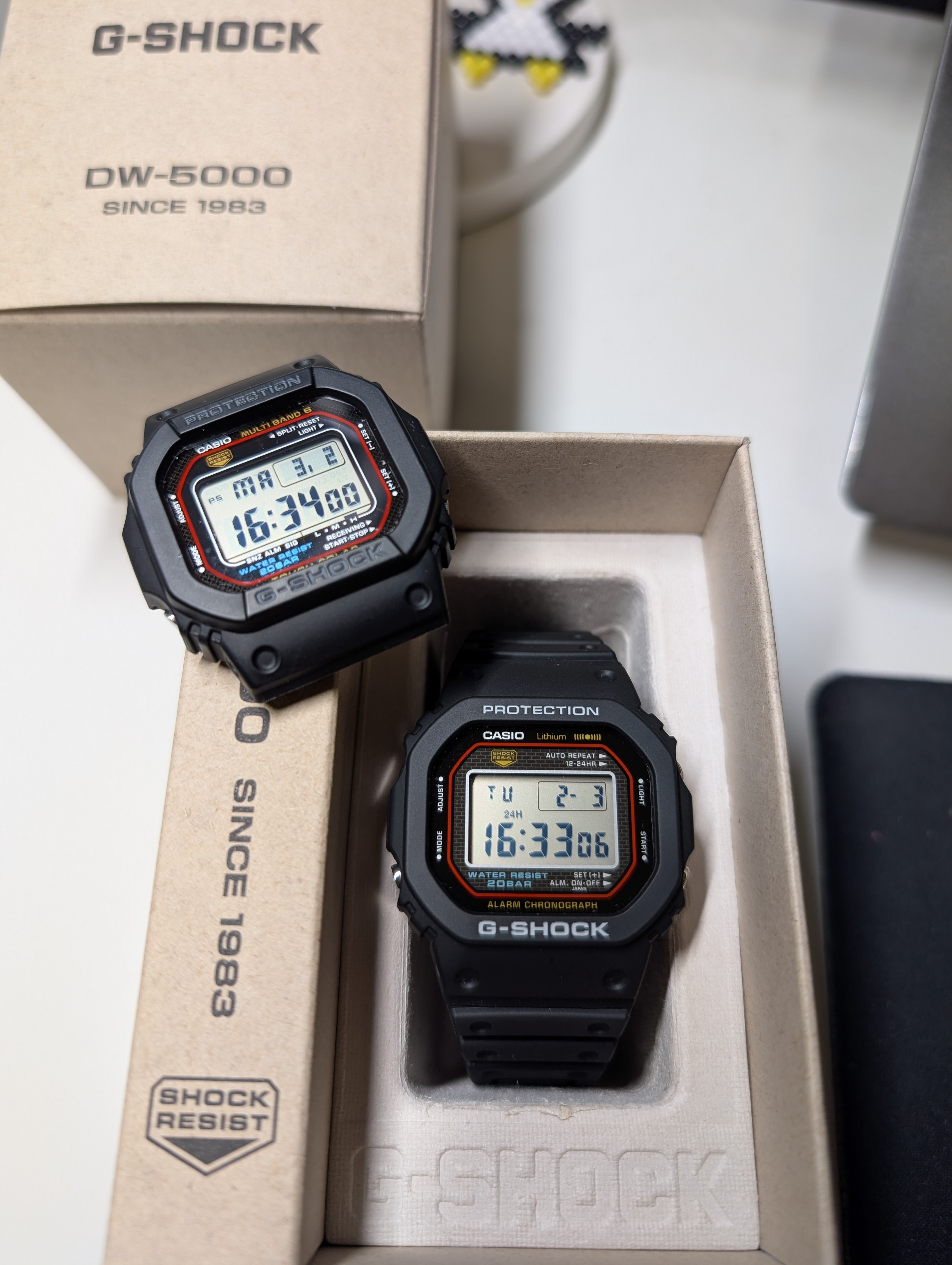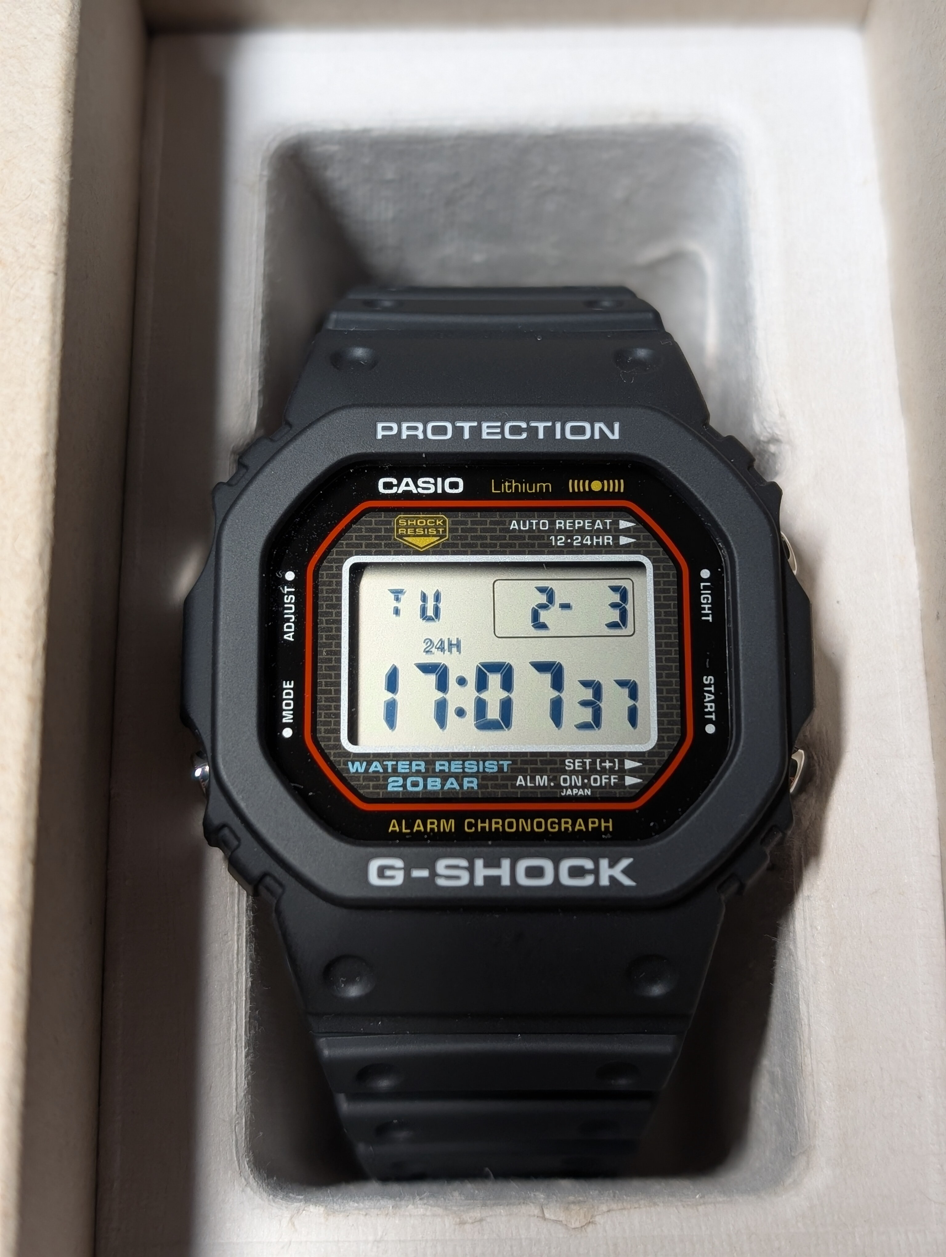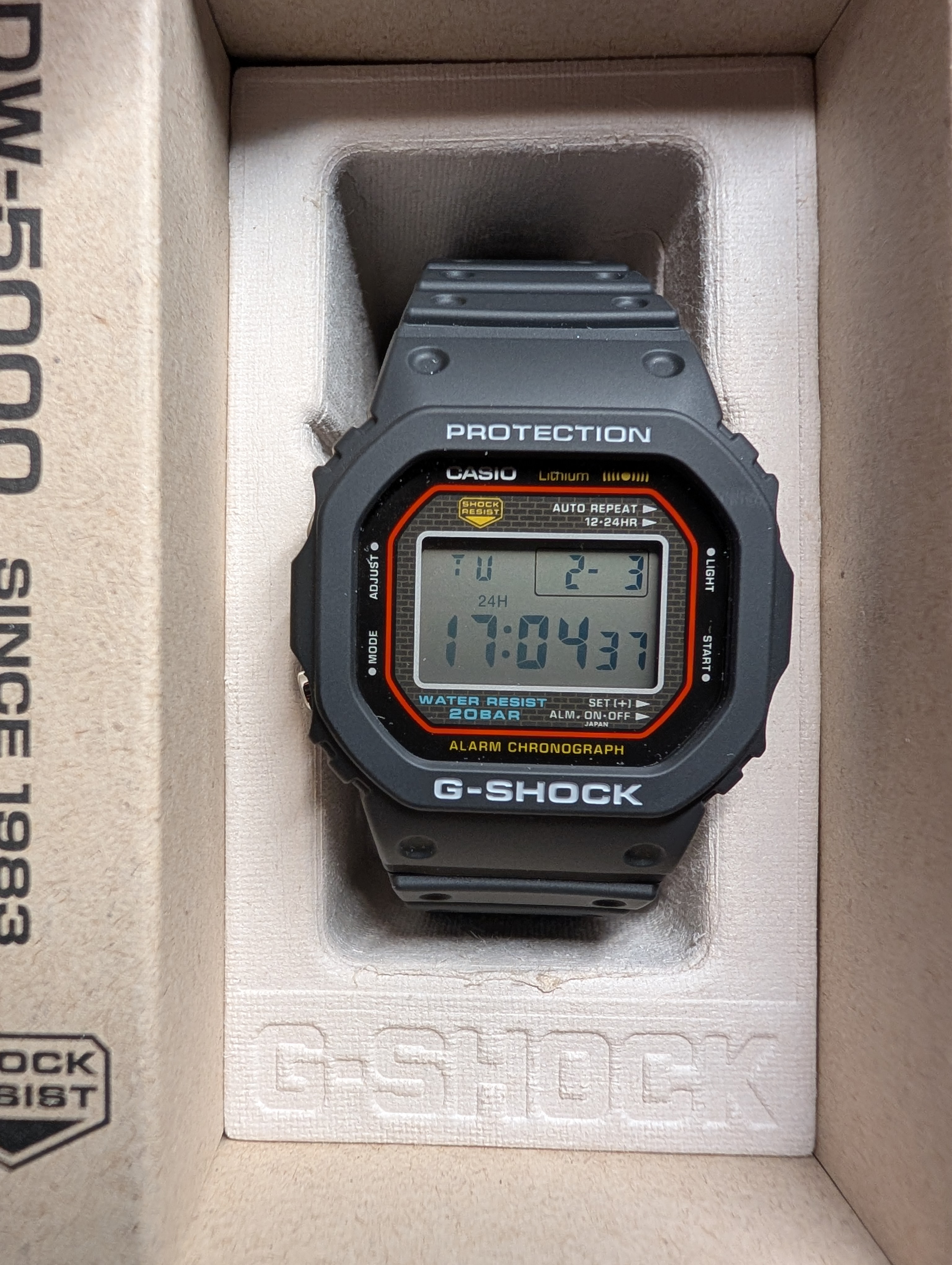 Por otro lado, el DW-5000R siempre me ha llamado mucho la atención desde que salió. He visto y leído prácticamente todo lo que hay por la red del que es una fiel reproducción del origen de los G-Shock en 1983. Caja de acero, trasera roscada, linea roja y el fondo de ladrillo son su mejor carta de presentación. Y claro, el siempre fiable Made in Japan.