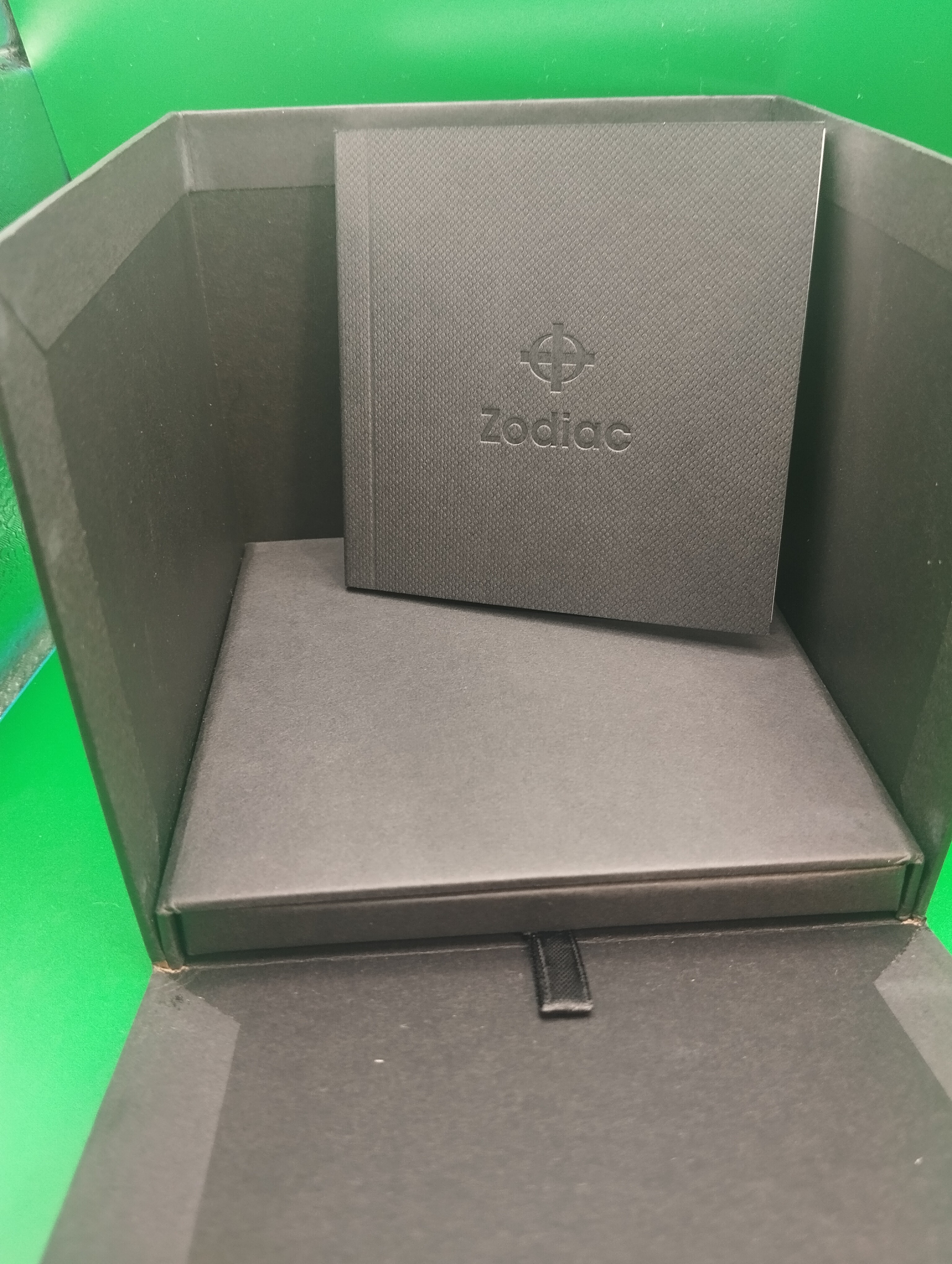 La caja tiene el habitual cajón inferior, donde reposan unas instrucciones genéricas de todos los relojes Zodiac. No hay tarjeta de garantía, ni nada más, salvo la etiqueta, que se me quedó en el despacho cuando abrí el paquete. Por mail he recibido la factura de Ocarat con la garantía, es correcto, pero ligeramente decepcionante.