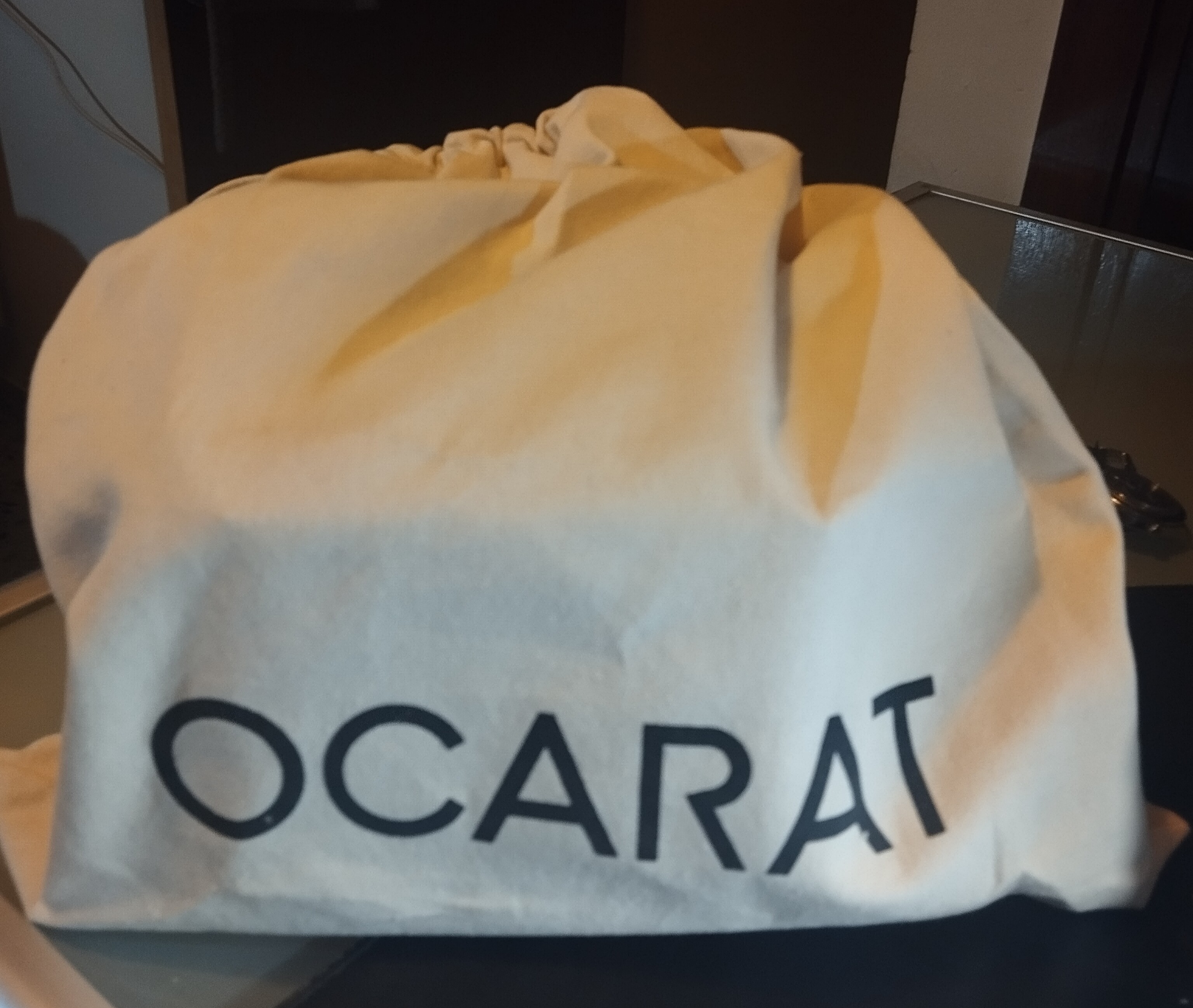 Tras la caja de embalaje exterior, abro y me sale una bonita bolsa de tela de Ocarat, que algún destino tendrá en el futuro.
