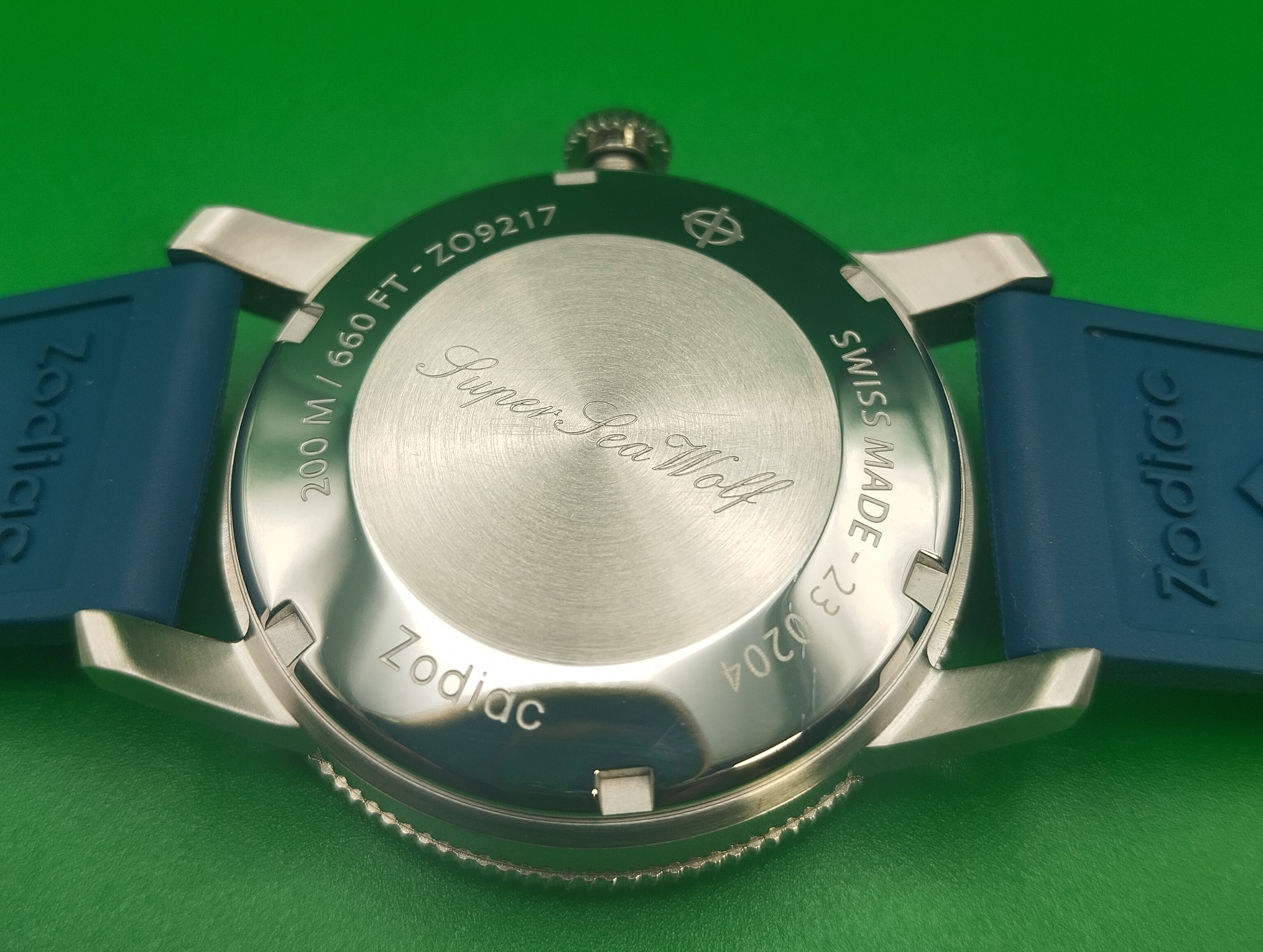 La caja es opaca (a mí me gustan más opacas que con visor, pero reconozco que este movimiento desconocido para mí me gustaría verlo), está marcado en el centro con el Super Sea Wolf y añade el swiss made, los 200 m de profundidad y la diana de la marca, está correcto.